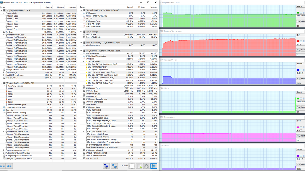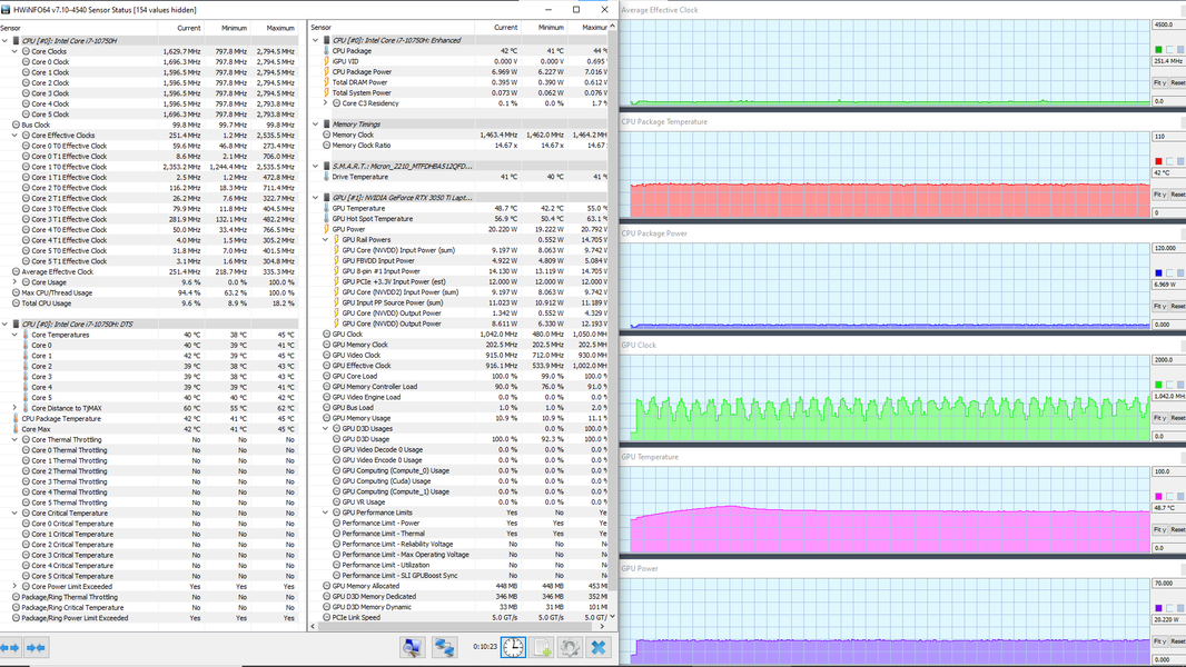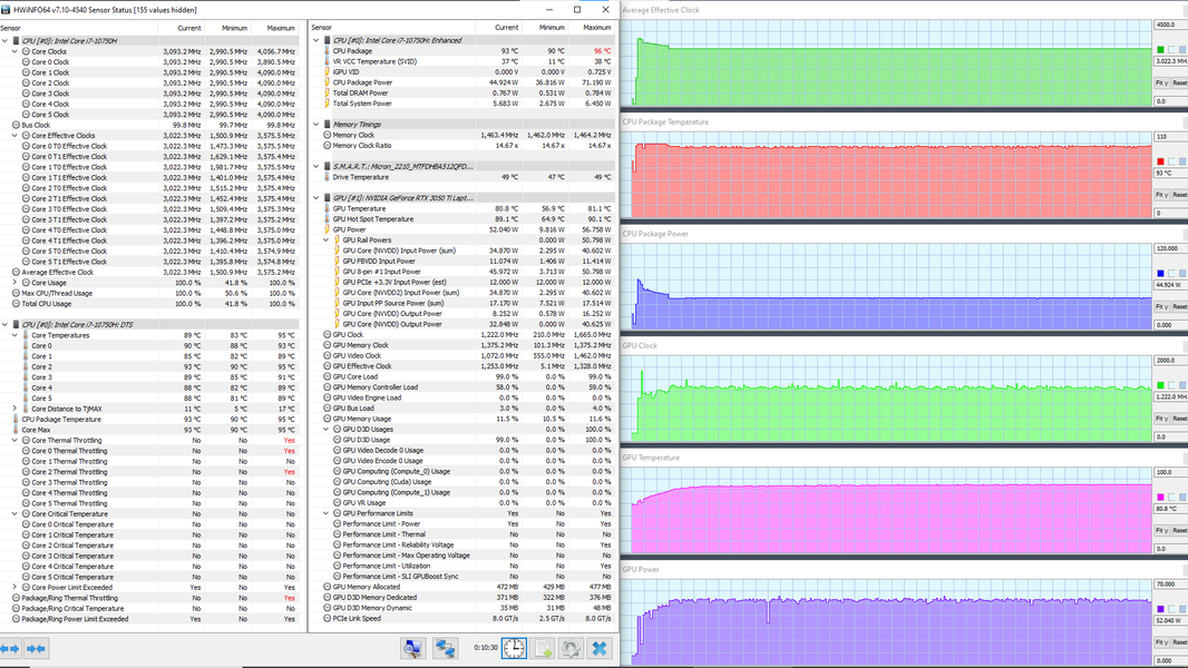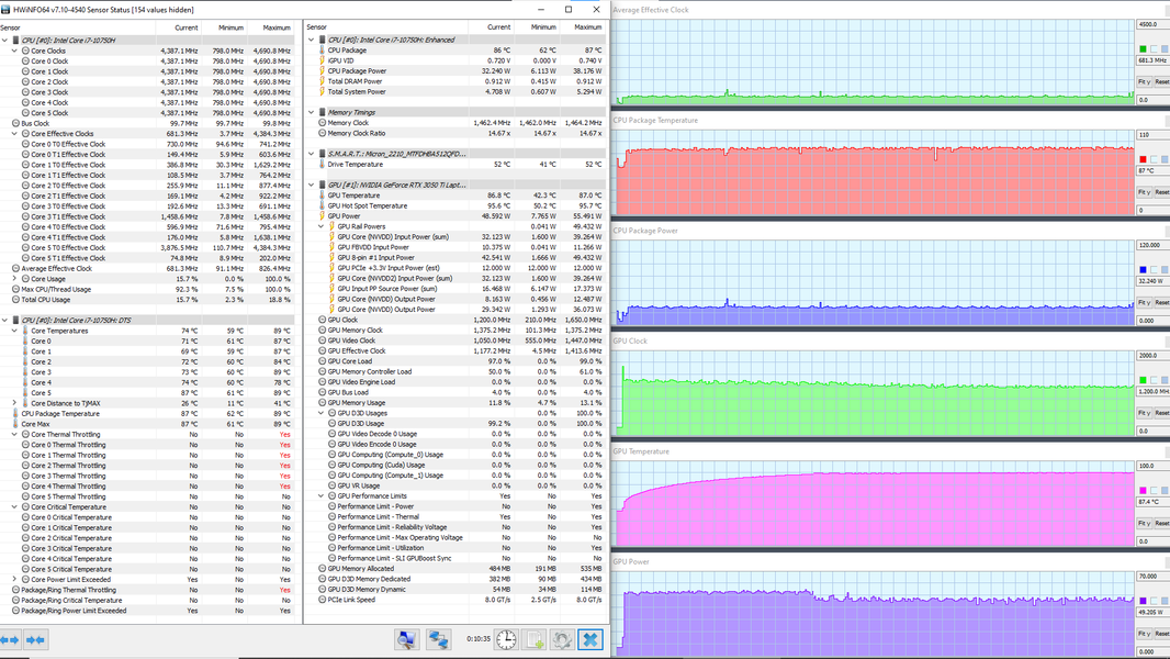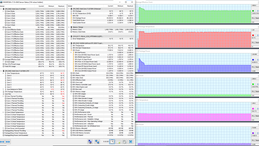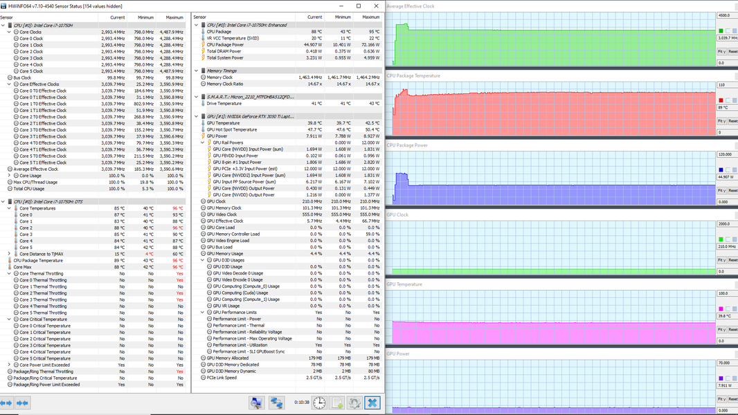 В ноутбуке используется 6-ядерный (12-поточный) процессор Intel Core i7-10750H с базовой частотой 2,6 ГГц и максимальной — 5,0 ГГц. Цифры внушительные, тем более что при тестировании под нагрузкой мы видели, как в профиле Extreme Performance процессор легко отбирает штатную мощность (TDP 45 Вт), а в пиках потребляет 71, 77 и даже 88 Вт. При этом он перегревается, а стабильность сохраняет как раз при штатных значениях. Посмотрим, какова будет производительность системы.