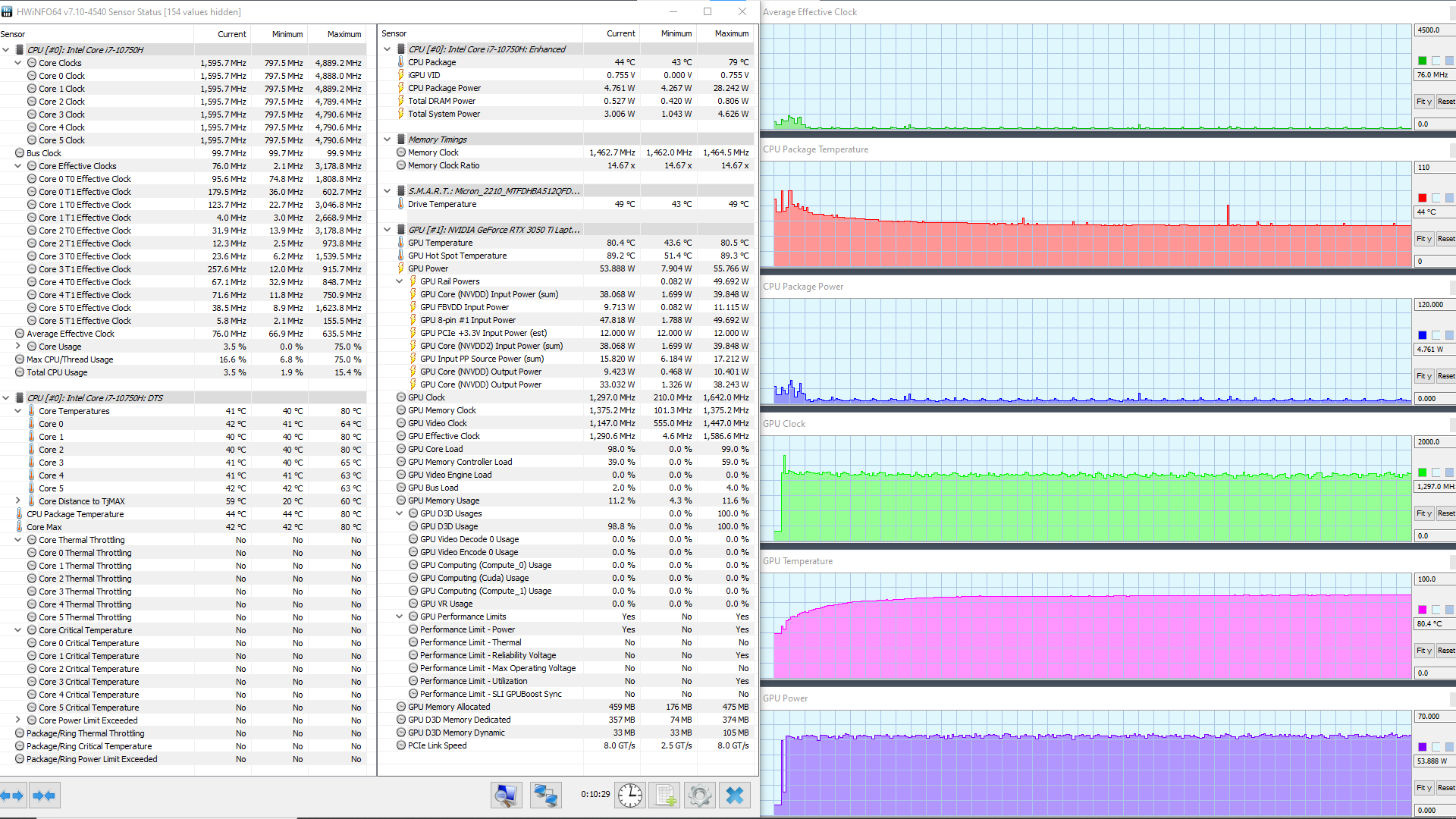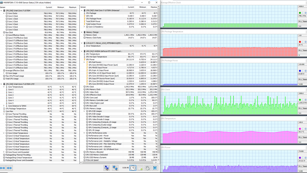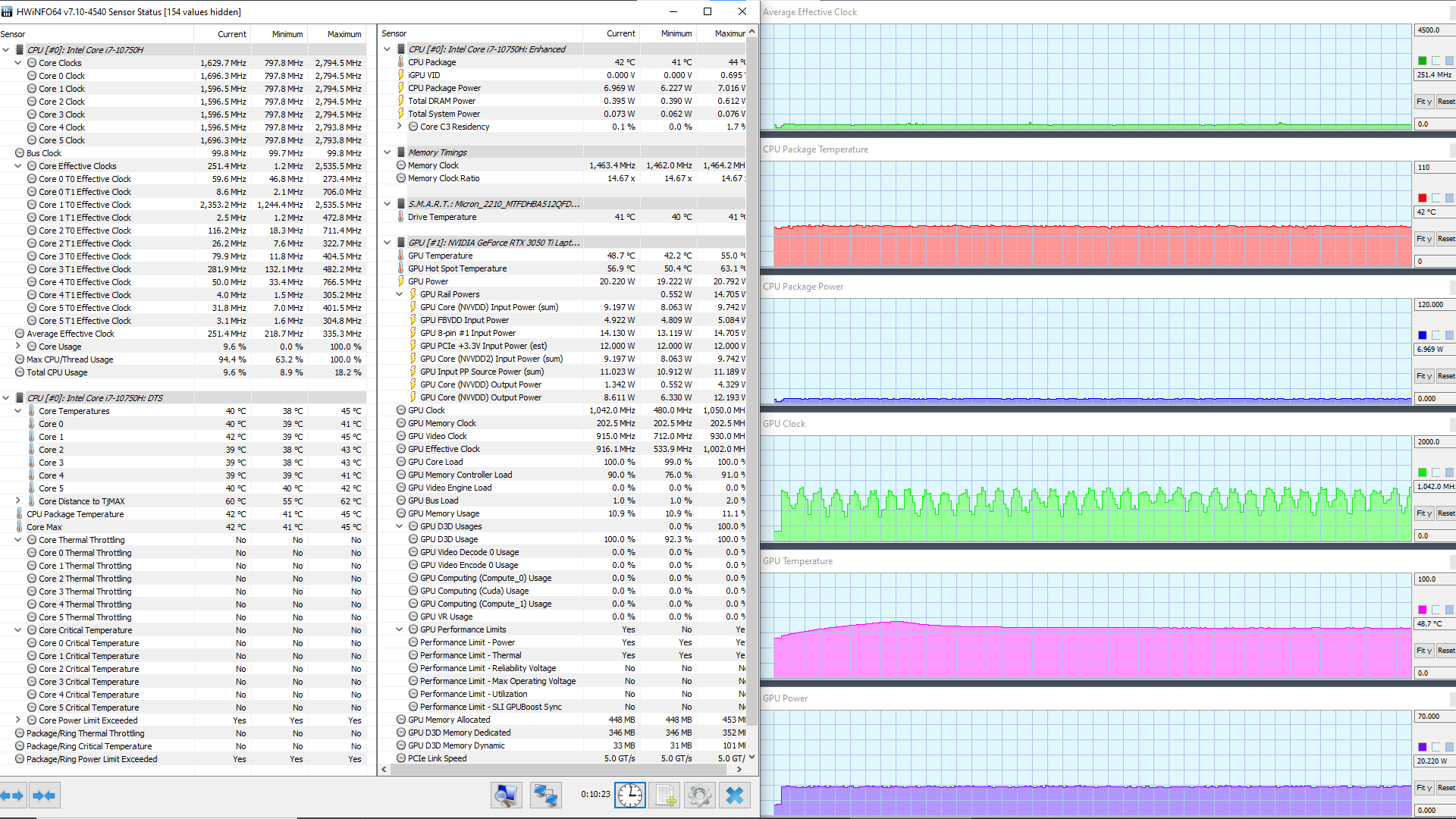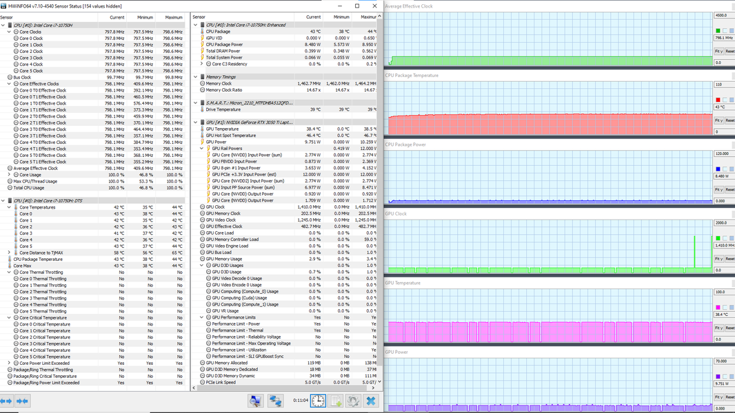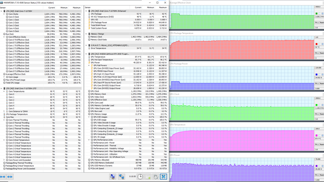 В ноутбуке используется 6-ядерный (12-поточный) процессор Intel Core i7-10750H с базовой частотой 2,6 ГГц и максимальной — 5,0 ГГц. Цифры внушительные, тем более что при тестировании под нагрузкой мы видели, как в профиле Extreme Performance процессор легко отбирает штатную мощность (TDP 45 Вт), а в пиках потребляет 71, 77 и даже 88 Вт. При этом он перегревается, а стабильность сохраняет как раз при штатных значениях. Посмотрим, какова будет производительность системы.