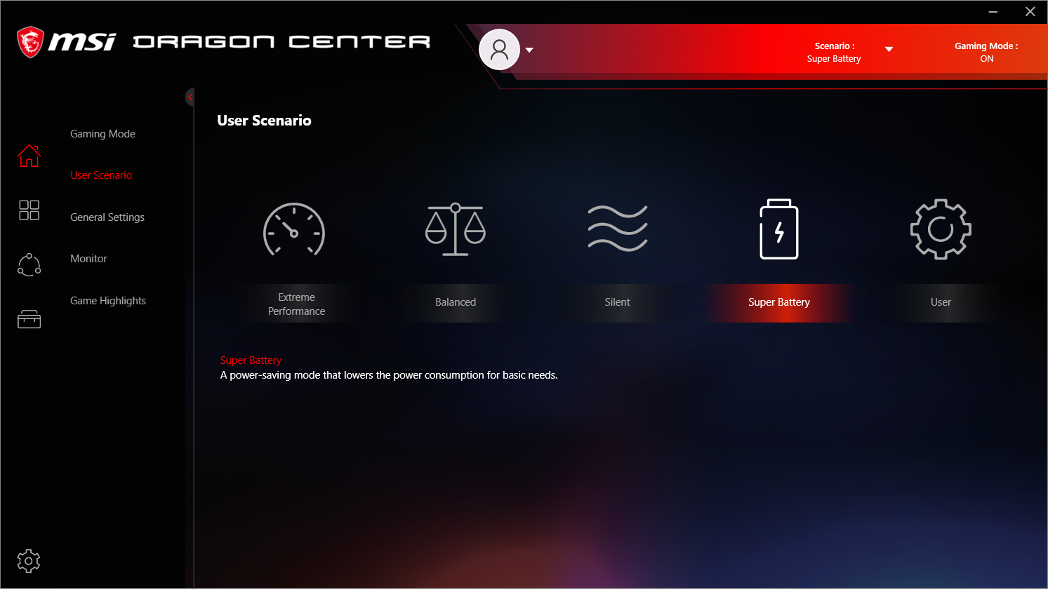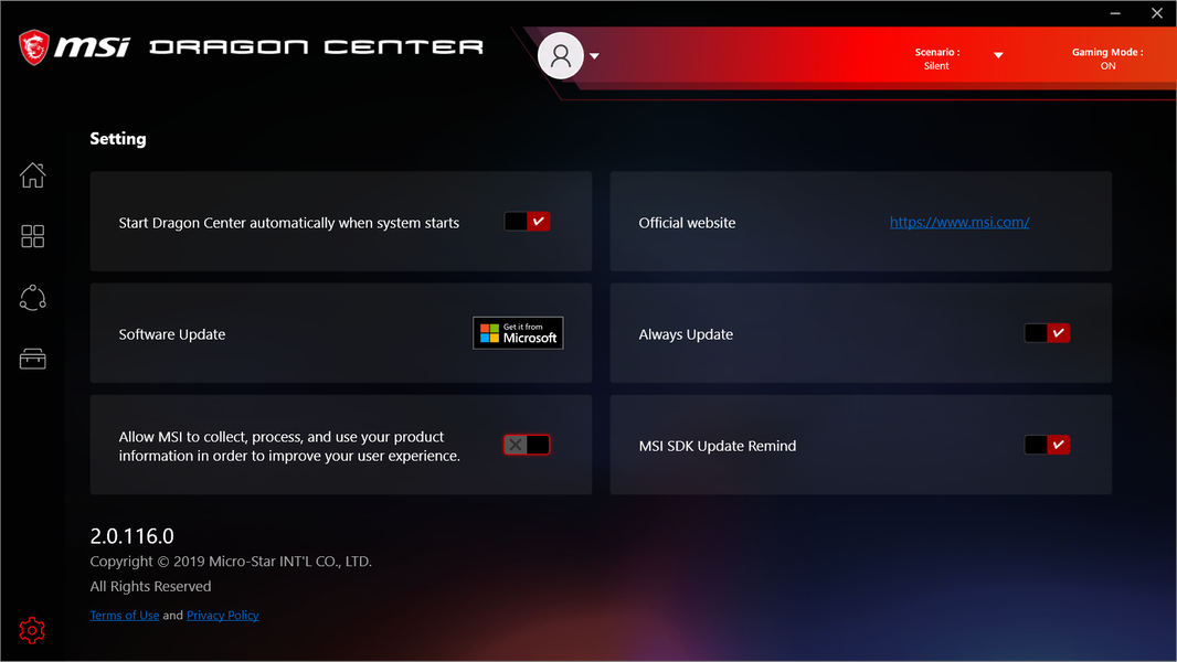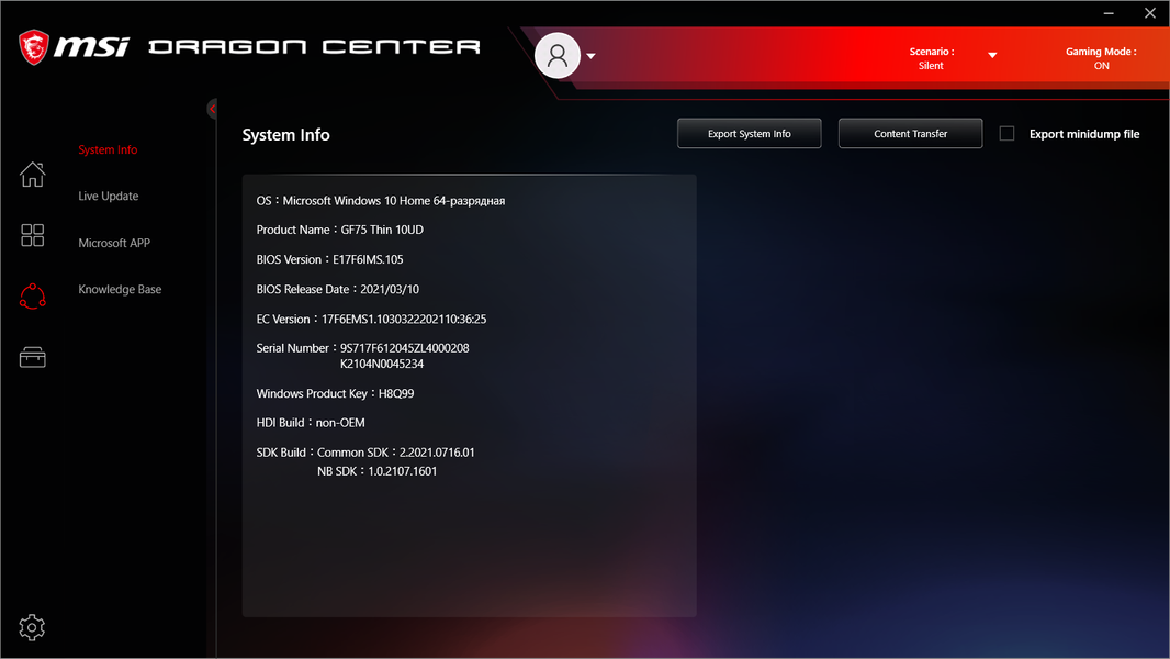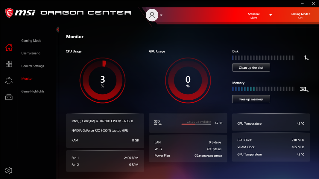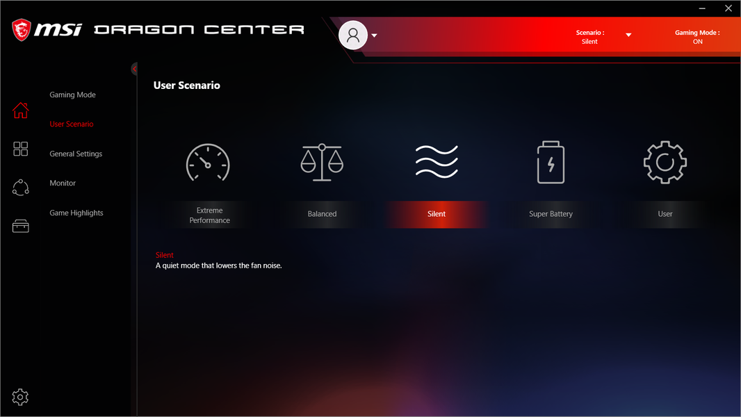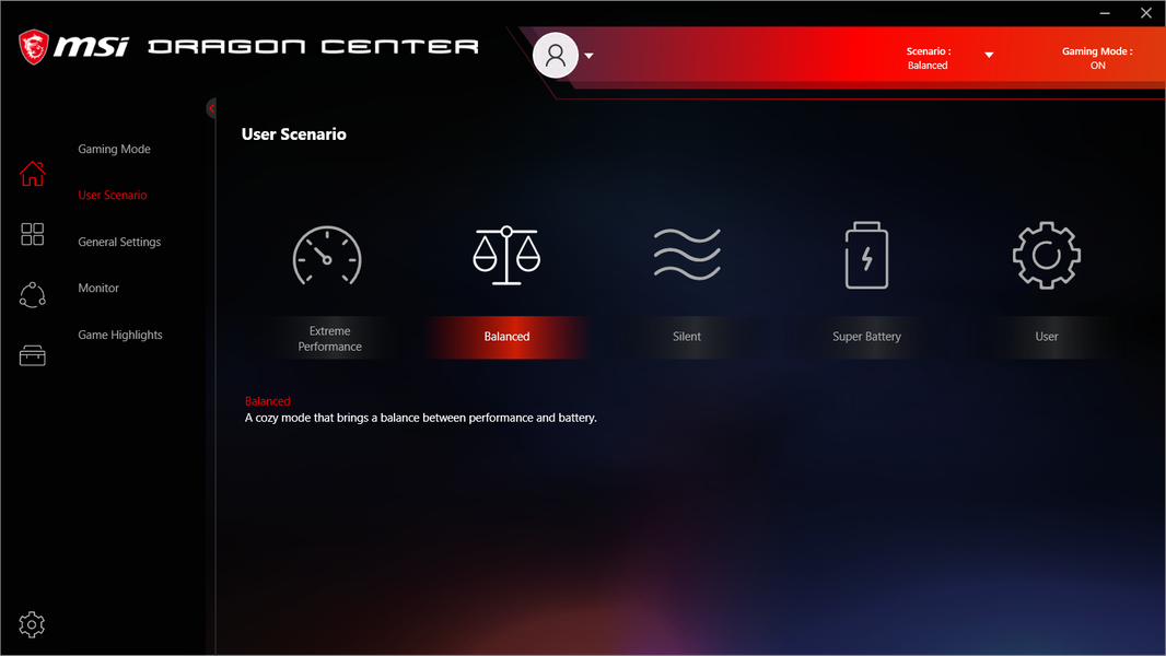 Ноутбук поставляется с Windows 10 Home, фирменными утилитами MSI Dragon Center, MSI Companion и Nahimic. Главной функцией фирменной утилиты Dragon Center является выбор сценария работы комплектующих и системы охлаждения. Всего предлагается 4 готовых пресета с очевидными названиями, а также пользовательский сценарий.