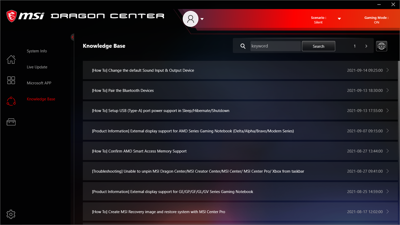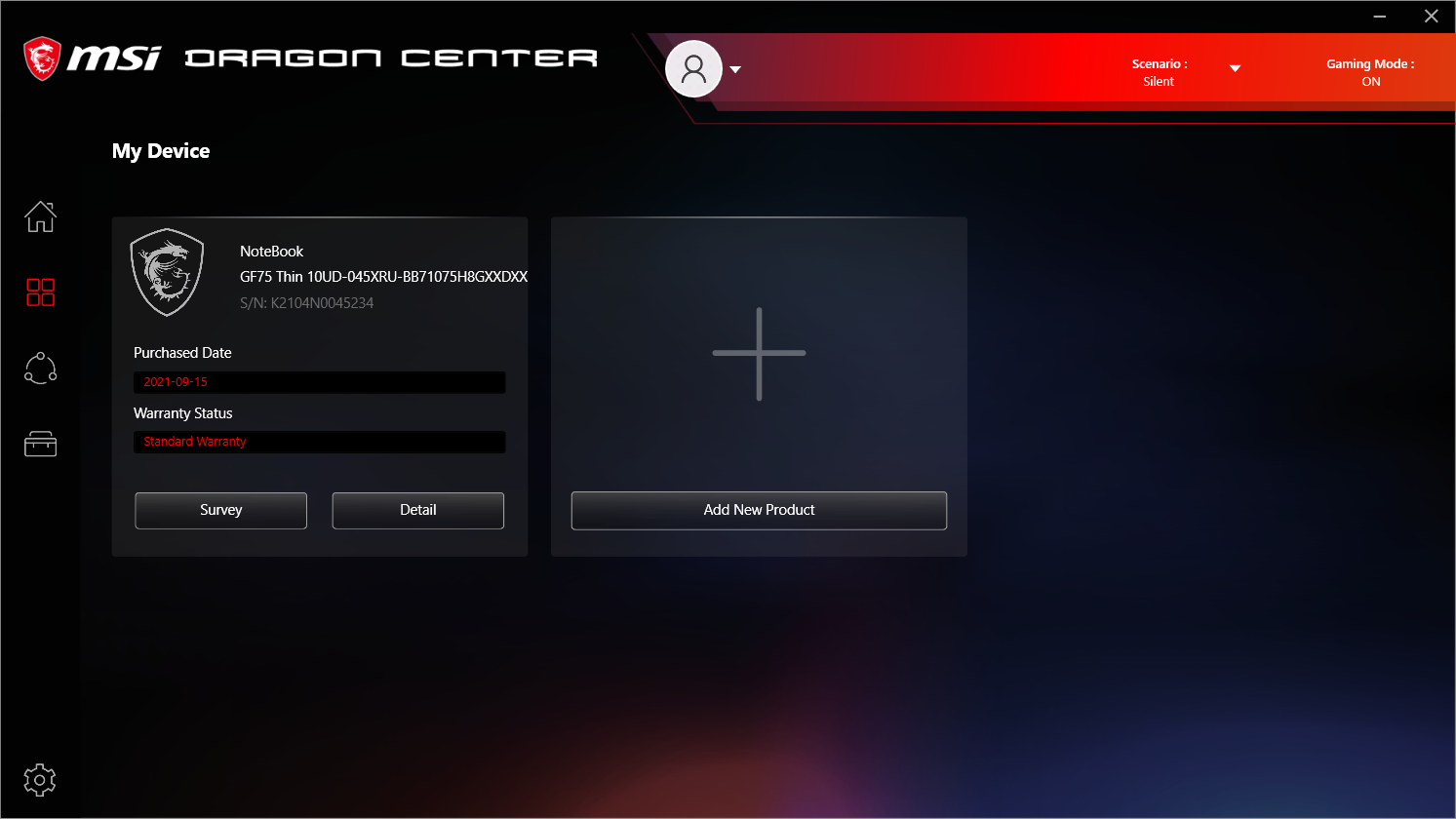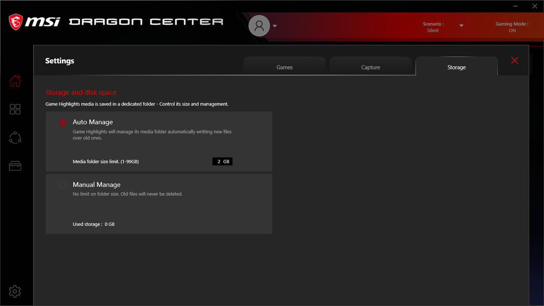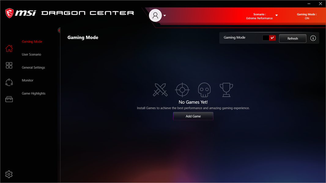 Ноутбук поставляется с Windows 10 Home, фирменными утилитами MSI Dragon Center, MSI Companion и Nahimic. Главной функцией фирменной утилиты Dragon Center является выбор сценария работы комплектующих и системы охлаждения. Всего предлагается 4 готовых пресета с очевидными названиями, а также пользовательский сценарий.