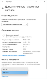 В настройках экрана на выбор доступны две частоты обновления — 60 и 144 Гц. По крайней мере, при родном разрешении экрана вывод идет с глубиной цвета 8 бит на цвет.