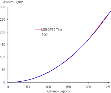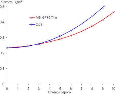 Далее мы измерили яркость 256 оттенков серого (от 0, 0, 0 до 255, 255, 255) при настройках по умолчанию. График ниже показывает прирост (не абсолютное значение!) яркости между соседними полутонами: