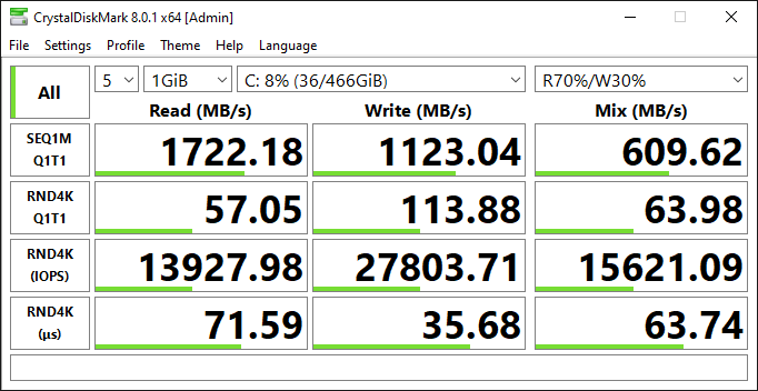 Согласно CrystalDiskMark, перед нами бюджетный вариант накопителя, который звезд с неба не хватает, но особо и не тормозит.