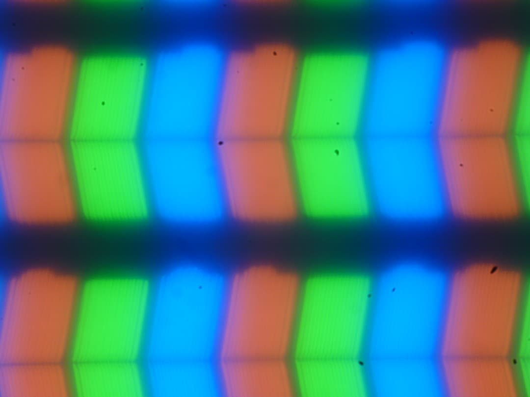 В этом ноутбуке используется матрица типа IPS. Микрофотографии демонстрируют типичную для IPS структуру субпикселей (черные точки — это пыль на матрице фотоаппарата):