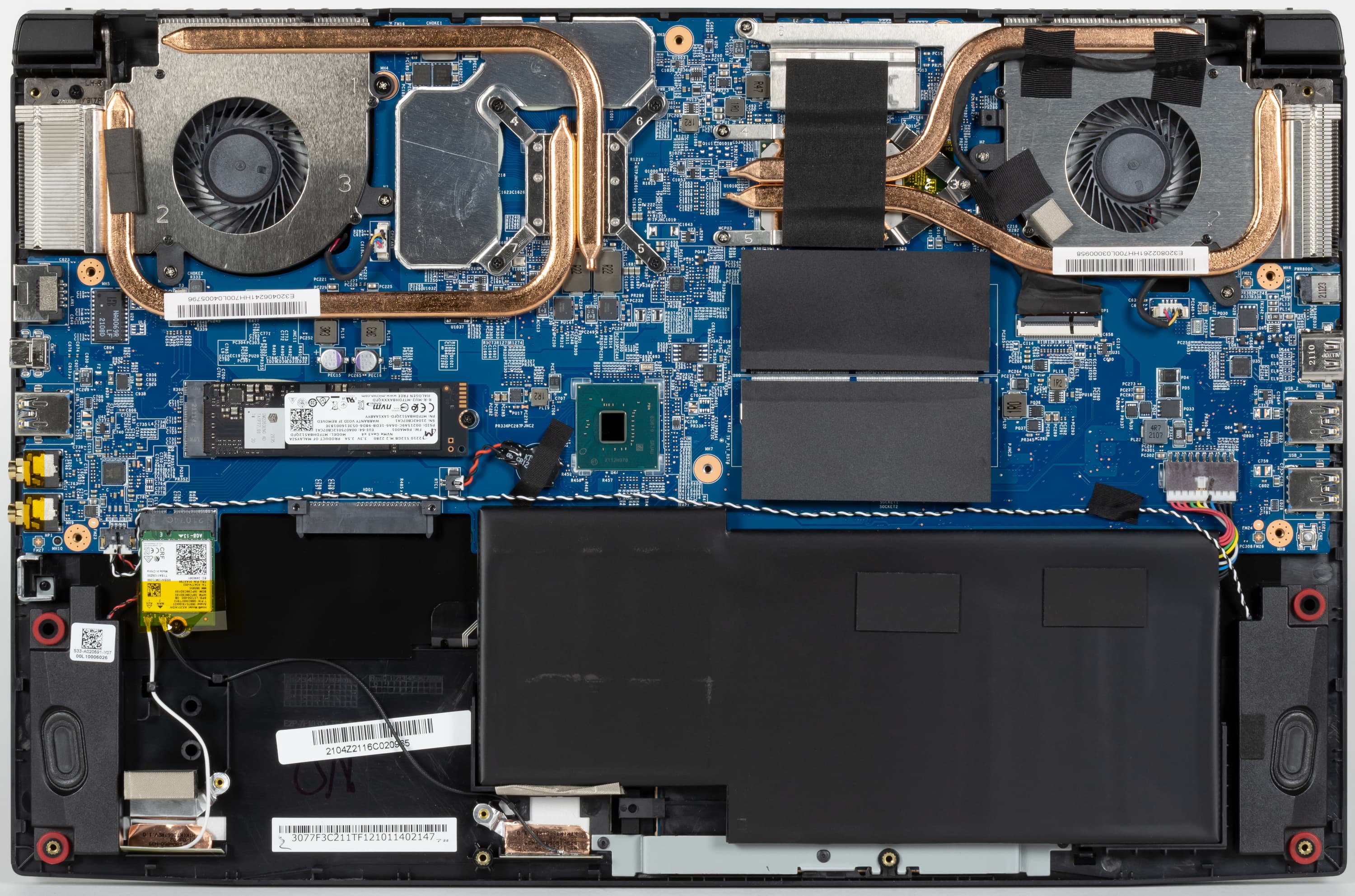 Чтобы снять нижнюю панель корпуса, нужно открутить 12 винтов крестовой отверткой. Это открывает доступ к начинке ноутбука. Система охлаждения и батарея относительно компактные.