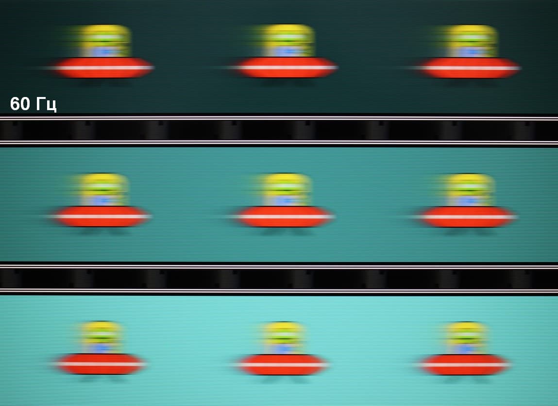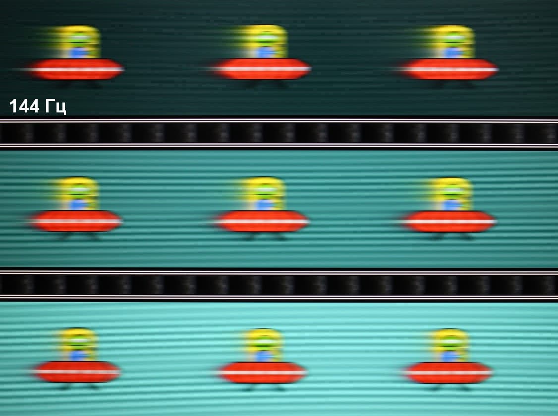 Для наглядного представления о том, что на практике означает такая скорость матрицы, какие могут быть артефакты от разгона, приведем серию снимков, полученных с помощью движущейся камеры. Такие снимки показывают, что видит человек, если он следит глазами за двигающимся на экране объектом. Описание теста приведено тут, страница с самим тестом тут. Использовались рекомендованные установки (скорость движения 960 пиксель/с для 60 Гц и 1008 пиксель/с для 144 Гц кадровой частоты), выдержка 1/15 с.