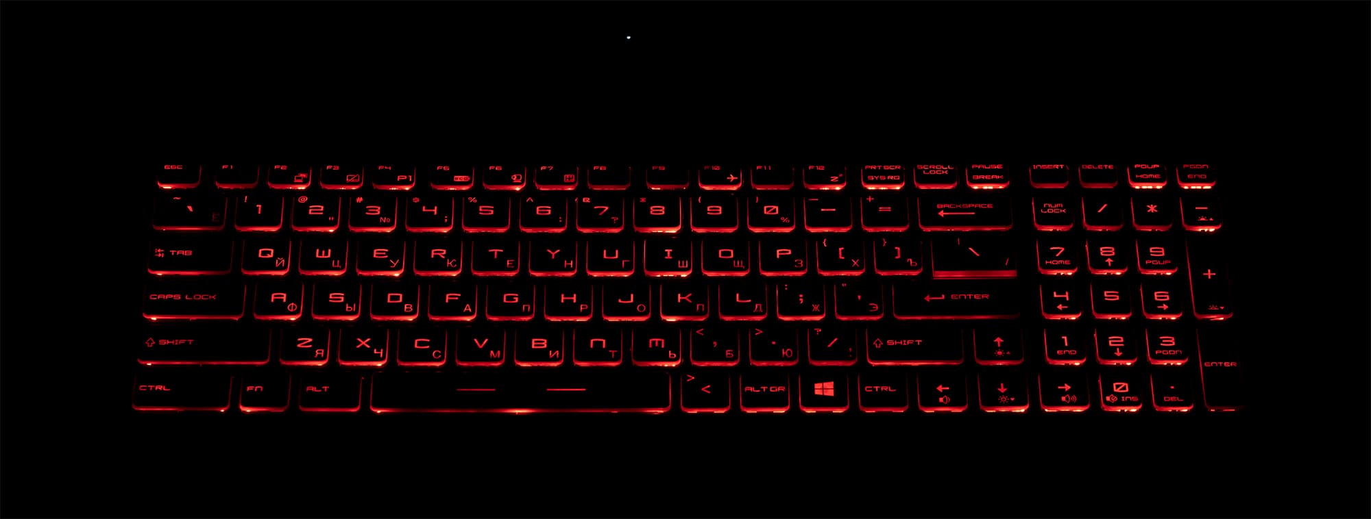 Предусмотрена красная подсветка, трехуровневая по яркости (четвертое состояние — выключена). Подсвечиваются сами символы на клавишах, их регистровые значения в функциональном ряду и боковые поверхности.