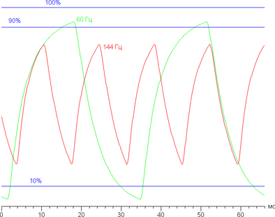 Также приведем зависимость яркости от времени при чередовании белого и черного кадра при 144 Гц кадровой частоты (и для сравнения при 60 Гц кадровой частоты):