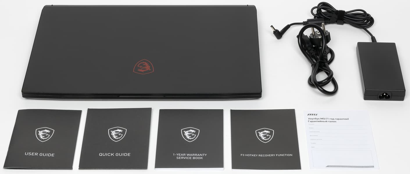 Вместе с ноутбуком в коробке можно найти адаптер питания на 150 Вт и печатную продукцию.
