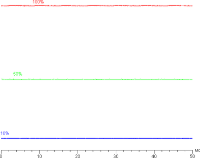 На любом уровне яркости значимая модуляция подсветки отсутствует, поэтому нет и никакого мерцания экрана. В доказательство приведем графики зависимости яркости (вертикальная ось) от времени (горизонтальная ось) при различных значениях настройки яркости: