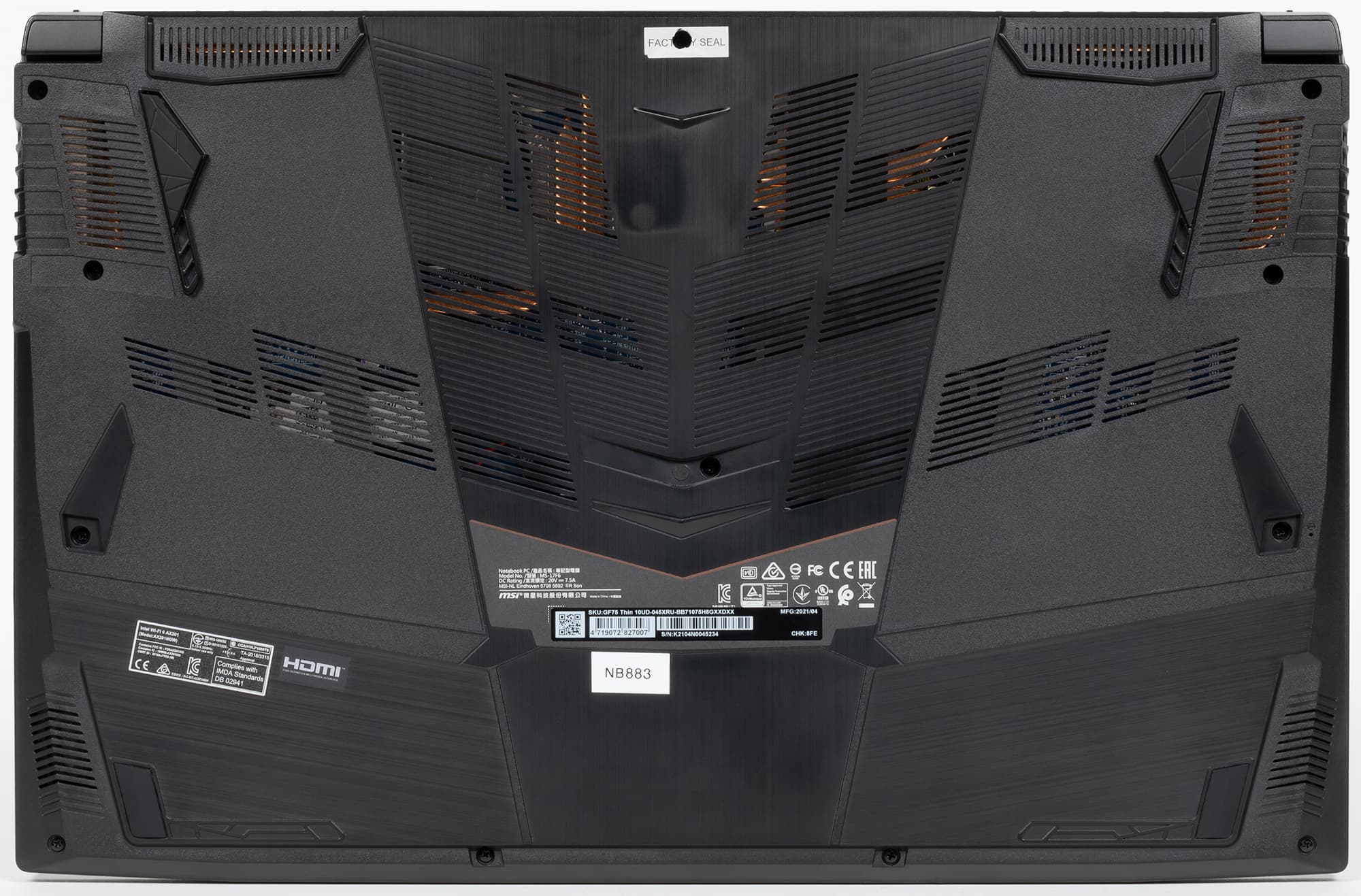 Герой нашего сегодняшнего обзора назван тонким не в насмешку, а совершенно справедливо. Разумеется, с ультрабуками его сравнивать нельзя, однако в данном случае речь идет не о сверхкомпактных моделях, а об игровых портативных ПК, и в этом классе, среди игровых ноутбуков с 17-дюймовыми экранами, MSI GF75 Thin 10UD-045XRU действительно оказывается одним из самых тонким и одним из самых легких. Итак, перед нами 17-дюймовый ноутбук — на это указывает первая цифра в индексе (GF75). Он оснащен процессором Intel Core 10-го поколения (прошлогодним) — об этом говорят первые две цифры суффикса после слова Thin, — а также дискретным видеоускорителем Nvidia GeForce RTX 3050 Ti Laptop, анонсированным 11 мая 2021 г. как бюджетное геймерское решение. Это, как принято говорить, модель начального уровня; по спецификациям и производительности она уступает другим Nvidia GeForce RTX 30 Laptop: всего 4 ГБ видеопамяти, меньшее число ядер CUDA, тензорных (Tensor AI) и трассировочных (RT). Но и стоимость Nvidia GeForce RTX 3050 Ti Laptop должна быть существенно ниже всех других видеокарт Nvidia GeForce RTX тридцатой серии, а это дает возможность производителям понизить цены геймерских ноутбуков. Подробнее об этом см. в нашем материале. В общем, ноутбук интересный. Дополнительные сведения о нем можно почерпнуть на веб-сайте производителя. Мы с удовольствием взялись за испытания, результаты которых представляем в настоящем обзоре. Начнем наше знакомство, как водится, со спецификаций.