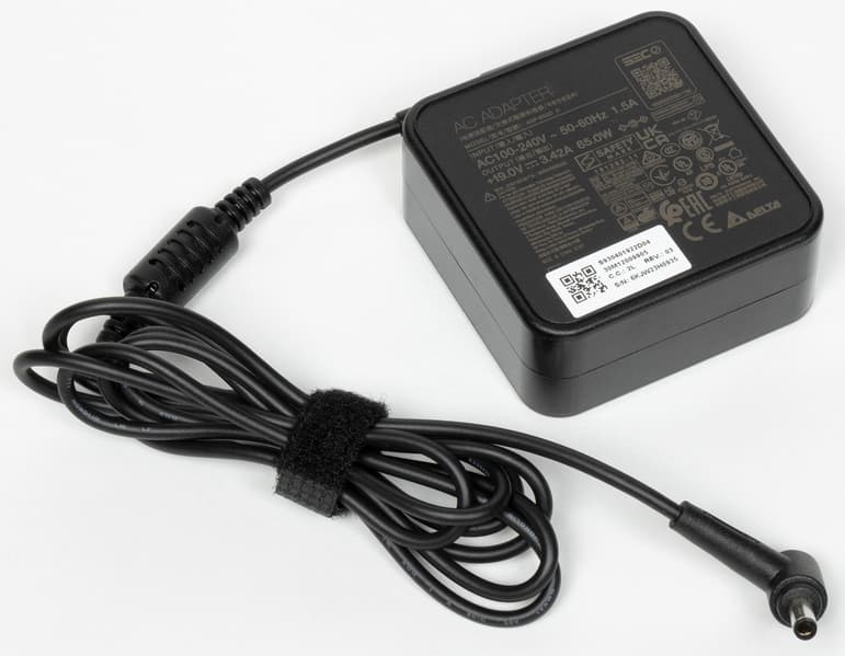 В комплекте с ноутбуком, не считая бумажной документации, можно найти только очень компактный и легкий адаптер питания (всего 194 г) на 65 Вт с суммарной длиной двух кабелей чуть больше 2 м. К сожалению, разъем питания у ноутбука проприетарный, а не USB Type-C, то есть адаптер не универсальный.