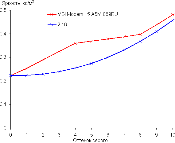 Аппроксимация полученной гамма-кривой дала показатель 2,16, что чуть ниже стандартного значения 2,2, при этом реальная гамма-кривая немного отклоняется от аппроксимирующей степенной функции: