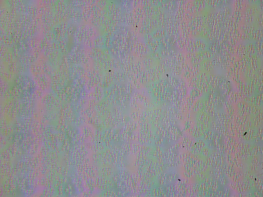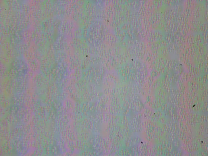 Зерно этих дефектов в несколько раз меньше размеров субпикселей (масштаб этих двух фотографий примерно одинаковый), поэтому фокусировка на микродефектах и «перескок» фокуса по субпикселям при изменении угла зрения выражены слабо, из-за этого практически нет «кристаллического» эффекта, но слабая вариация яркости и оттенка в масштабах субпикселей присутствует.