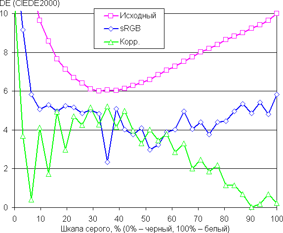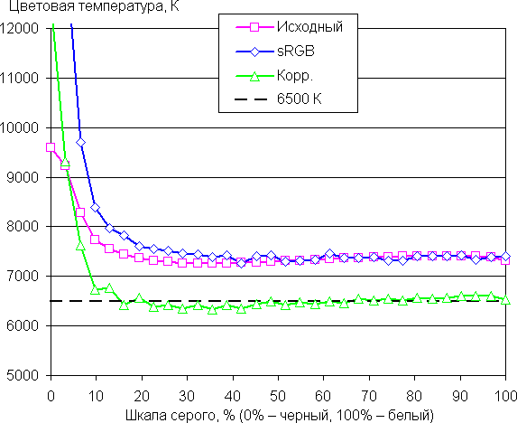 По умолчанию (выбран профиль sRGB) баланс оттенков на шкале серого хороший, так как цветовая температура не сильно выше стандартных 6500 К, а отклонение от спектра абсолютно черного тела (ΔE) ниже 10, что для потребительского устройства считается приемлемым показателем. При этом цветовая температура и ΔE мало изменяются от оттенка к оттенку — это положительно сказывается на визуальной оценке цветового баланса. (Самые темные области шкалы серого можно не учитывать, так как там баланс цветов не имеет большого значения, да и погрешность измерений цветовых характеристик на низкой яркости большая.)