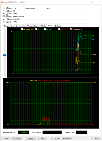 При максимальной нагрузке на процессор его ядра сначала работают на частоте 2,8-2,9 ГГц, потребление процессора, по данным встроенного датчика, составляет 55 Вт, температура ядер близка к критической, так что включается тротлинг. Через некоторое время потребление процессора ограничивается на уровне штатного TDP (45 Вт), при этом устанавливается частота ядер 2,6-2,7 ГГц, температура ядер ниже 90 градусов, перегрева и пропуска тактов нет. В таком режиме ноутбук может, по всей видимости, работать неограниченно долго.
