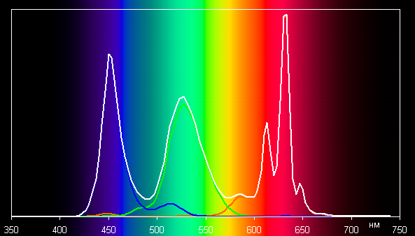 Ниже приведен спектр для белого поля (белая линия), наложенный на спектры красного, зеленого и синего полей (линии соответствующих цветов):