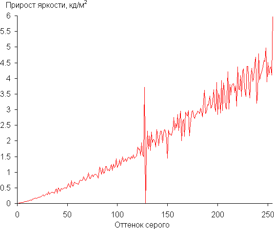 Далее мы измерили яркость 256 оттенков серого (от 0, 0, 0 до 255, 255, 255). График ниже показывает прирост (не абсолютное значение!) яркости между соседними полутонами: