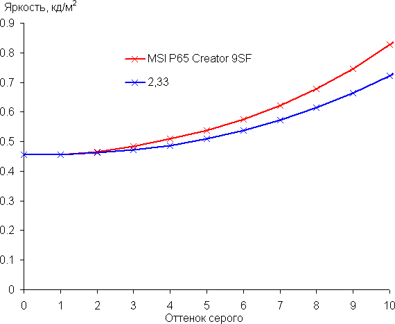 Рост прироста яркости на большей части шкалы серого равномерный. В самой темной области первый оттенок серого, согласно аппаратным тестам, по яркости минимально отличается от черного (а визуально не отличается):