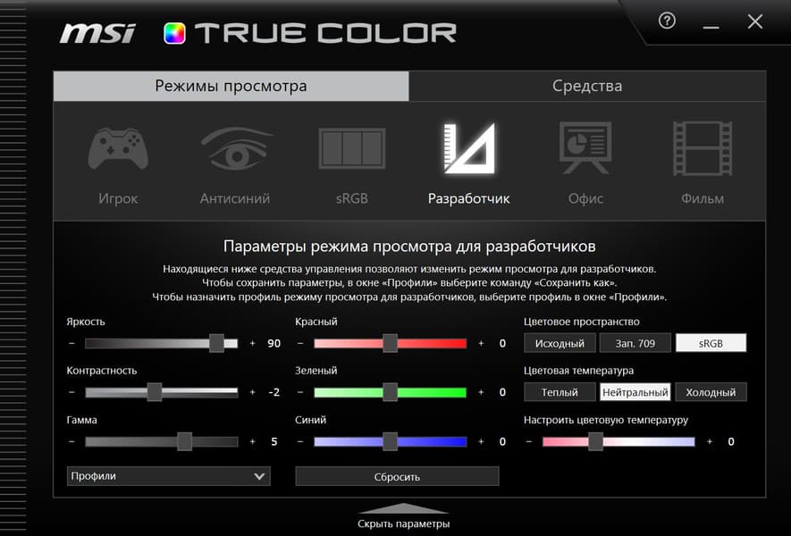 Однако охват в этом профиле до границ sRGB не корректируется. В случае профиля Разработчик доступных настроек больше: