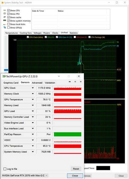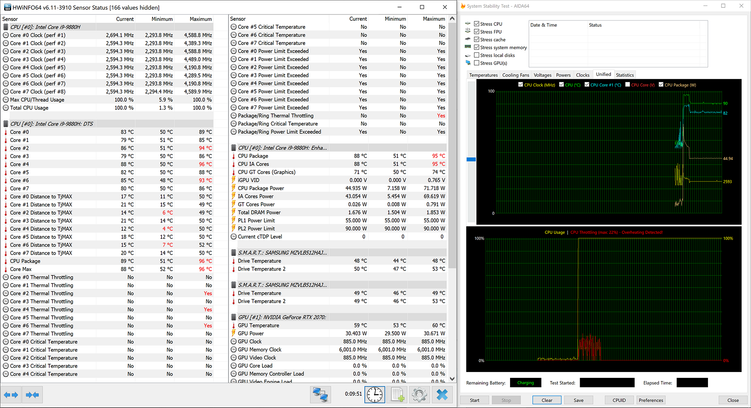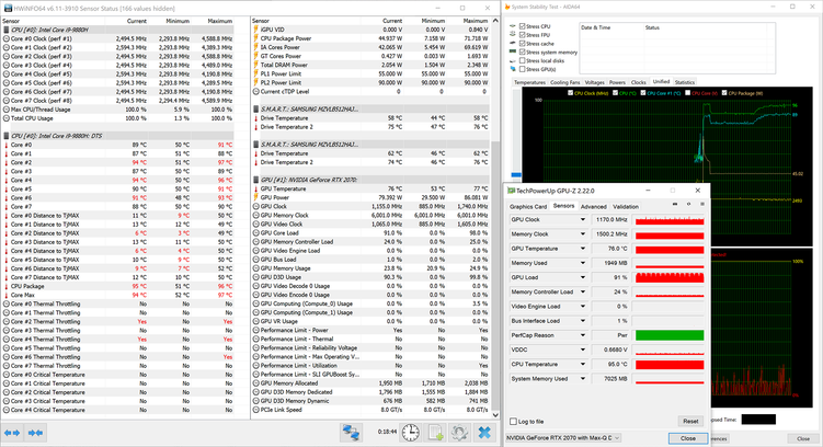 При одновременной максимальной нагрузке на процессор и GPU установившаяся частота ядер процессора равна 2,5-2,6 ГГц, его потребление составляет штатные 45 Вт, но температура ядер подбирается к 100 градусам, так что процессор перегревается, есть пропуск тактов. GPU при этом работает в штатном максимальном режиме (см. выше), не нагреваясь выше 77 градусов.