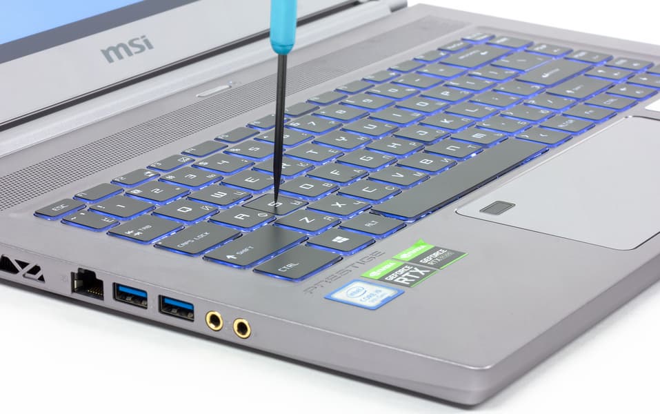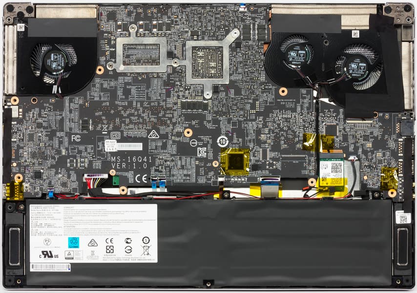 Чтобы снять нижнюю панель корпуса, надо открутить несколько винтиков под крестовую отвертку. После этого, вопреки современным нормам, вы получите доступ лишь к кулерам и беспроводному сетевому модулю. Для всего остального потребуется более глубокая разборка (открутить еще несколько винтов, отсоединить несколько шлейфов), которую мы не проводили. MSI сообщает, что модули памяти и SSD-накопители на обратной стороне материнской платы установлены в соответствующие слоты, ничего не распаяно, так что можно быстро (в том числе самостоятельно, если у вас есть соответствующие навыки) заменить эти комплектующие.