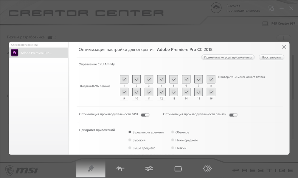 Еще одна забавная функция утилиты Creator Center — включение так называемого режима разработчика. В данном случае это, по всей видимости, не очень удачный русский перевод: имеется в виду вообще любая профессиональная занятость, для которой требуется мощный компьютер. Так или иначе, на специальной вкладке можно добавить любое приложение к подготовленному производителем списку (в него входят пакеты Adobe, Corel, Magix и др.), и для всех приложений этого списка автоматически применяется при запуске настраиваемый профиль CPU Affinity (привязка к конкретным ядрам, что актуально, например, если программа плохо переносит «виртуальные ядра» Hyper-Threading), выставляется указанный приоритет, выполняются некие оптимизации производительности GPU и памяти. В общем, все это можно сделать и «ручками», но здесь это реализовано наглядно и удобно.