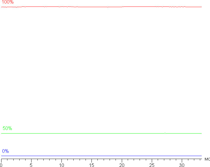 Если настройка яркости равна 0%, то яркость снижается до 9 кд/м². Таким образом, в полной темноте яркость экрана можно понизить до комфортного уровня. На любом уровне яркости значимая модуляция подсветки отсутствует, поэтому нет и никакого мерцания экрана. В доказательство приведем графики зависимости яркости (вертикальная ось) от времени (горизонтальная ось) при различных значениях настройки яркости: