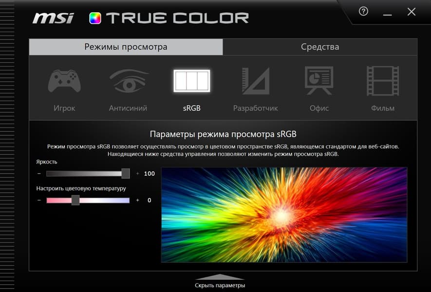 Присутствует фирменная утилита True Color, с помощью которой можно изменить ряд настроек экрана. Доступность настроек зависит от выбранного профиля. По умолчанию выбран профиль sRGB.