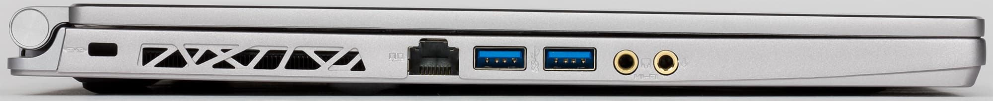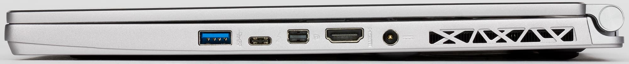 На задней панели корпуса интерфейсных разъемов нет — только вентиляционные отверстия. Такие же отверстия скрыты за стилизованной решеткой по бокам корпуса. Все они служат для выброса горячего воздуха. На левом боку корпуса можно найти отверстие кенсингтонского замка, разъем проводной сети (RJ-45), 2 порта USB 3.0 Type-A и 2 миниджека для подключения микрофона и наушников. На правом — разъем питания под круглый в сечении штекер, видеовыходы HDMI и Mini-DisplayPort, а также разъем USB 3.1 Type-C, совместимый с DP и Thunderbolt 3, и один USB 3.1 Type-A.