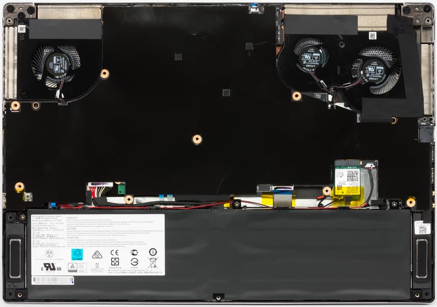 В ноутбуке установлены два кулера, причем один из них имеет сразу два вентилятора (они работают синхронно). По всей видимости, тепловые трубки обоих кулеров проходят и через площадку на CPU, и через площадку на GPU, так что в охлаждении всегда участвуют оба кулера, даже если видеокарта не используется. Вентиляторы всасывают холодный воздух в основном через отверстия на днище корпуса, а горячий выдувают назад и вбок (каждый в свою сторону). Частота вращения у вентиляторов довольно высокая: около 3000 об/мин под нормальной нагрузкой и около 6000 об/мин в максимальном режиме. Максимальный режим охлаждения в данном случае можно выбрать только настройкой текущего профиля в фирменной утилите Creator Center, хотя обычно игровые ноутбуки MSI имеют на корпусе выделенную кнопку для его активации. При включении Cooler Boost кулеры раскручиваются примерно до 6000 об/мин и не регулируют скорость вращения в зависимости от текущей нагрузки.