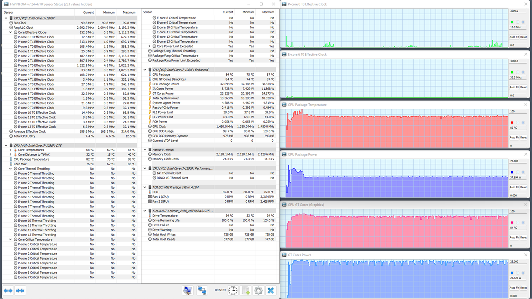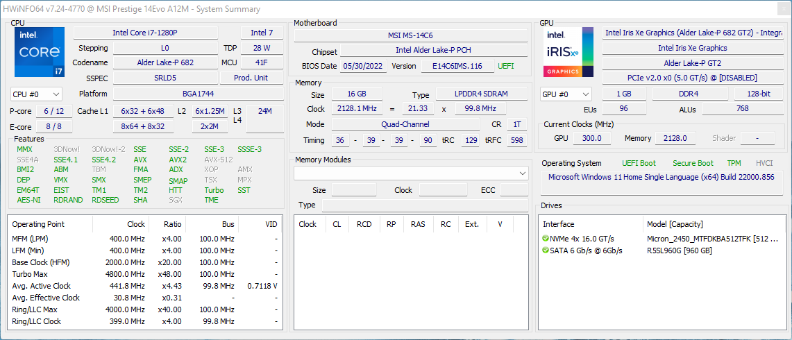 Напомним, что в MSI Prestige 14 Evo A12M-248RU установлен мобильный процессор Intel Core i7-1280P со штатным тепловыделением 28 Вт и 64 Вт в турборежиме. Этот чип объединяет в себе 14 ядер: