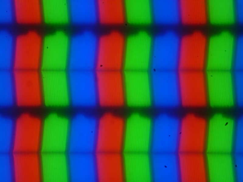 В этом ноутбуке используется матрица типа IPS. Микрофотографии демонстрируют типичную для IPS структуру субпикселей (черные точки — это пыль на матрице фотоаппарата):