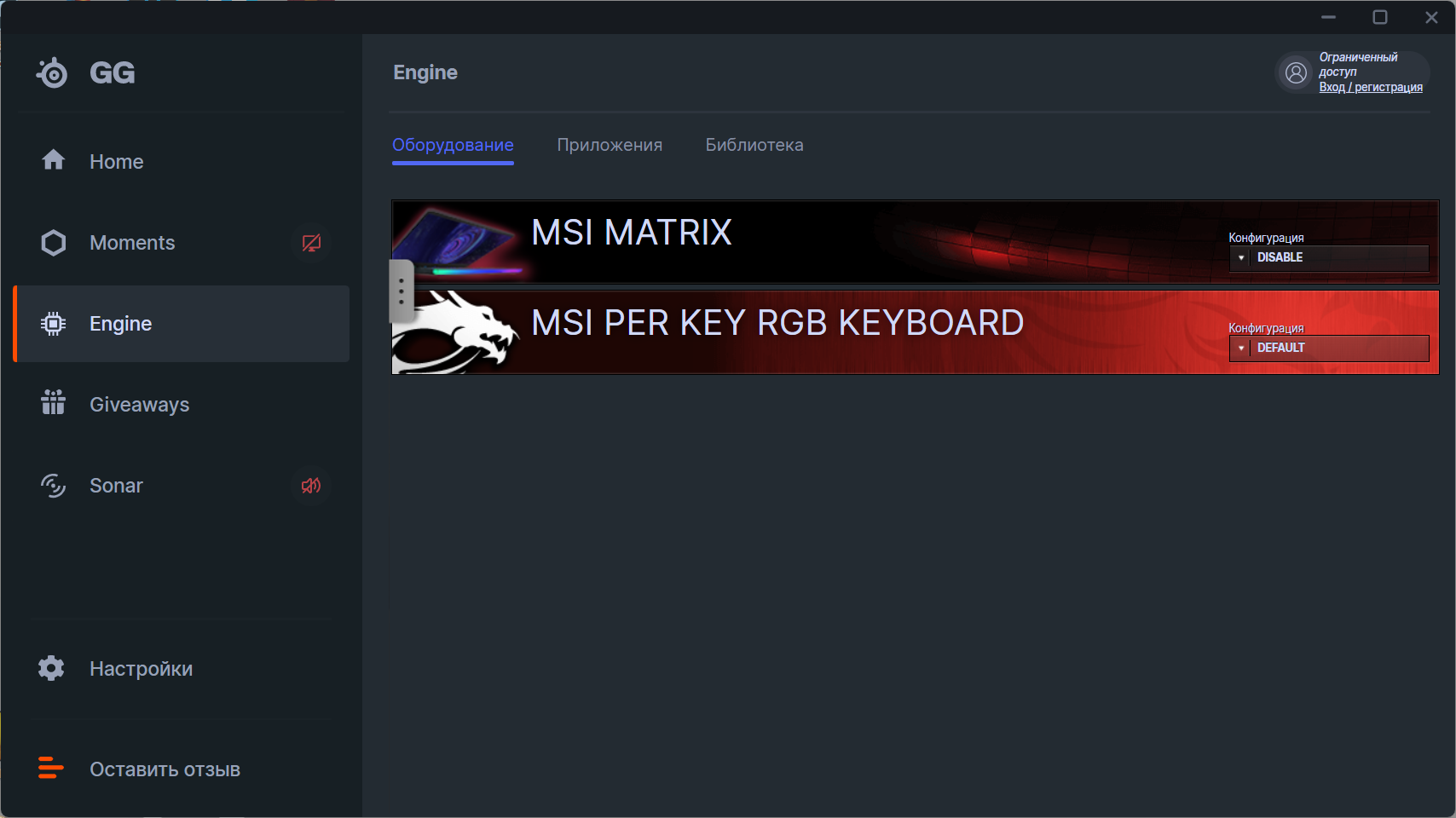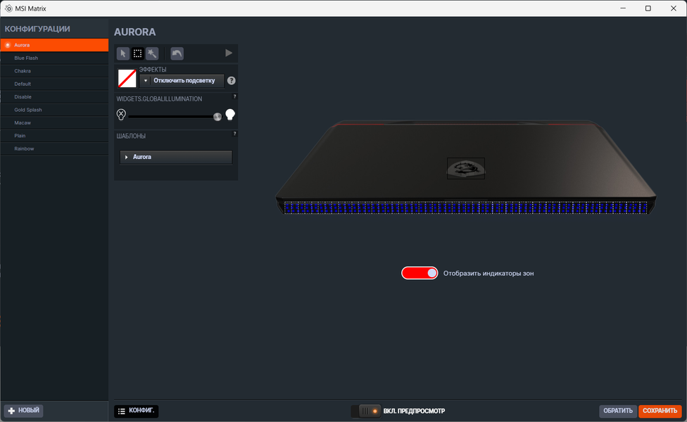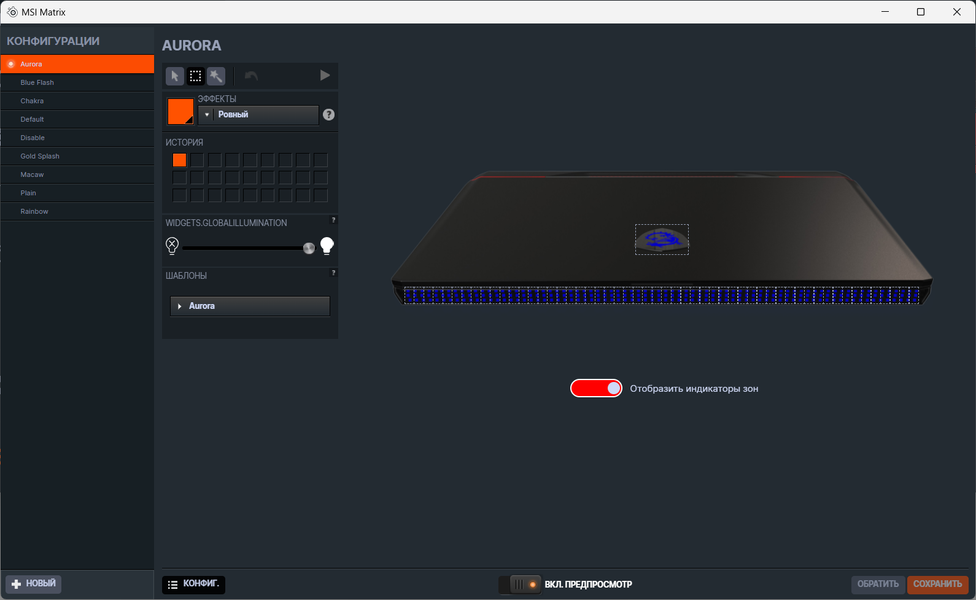 Еще в одном окне с названием MSI Matrix управляем декоративными элементами подсветки — фронтальной полосой и логотипом. Принципы управления те же, что и для клавиатуры: конфигурации с эффектами и выбираемыми параметрами.