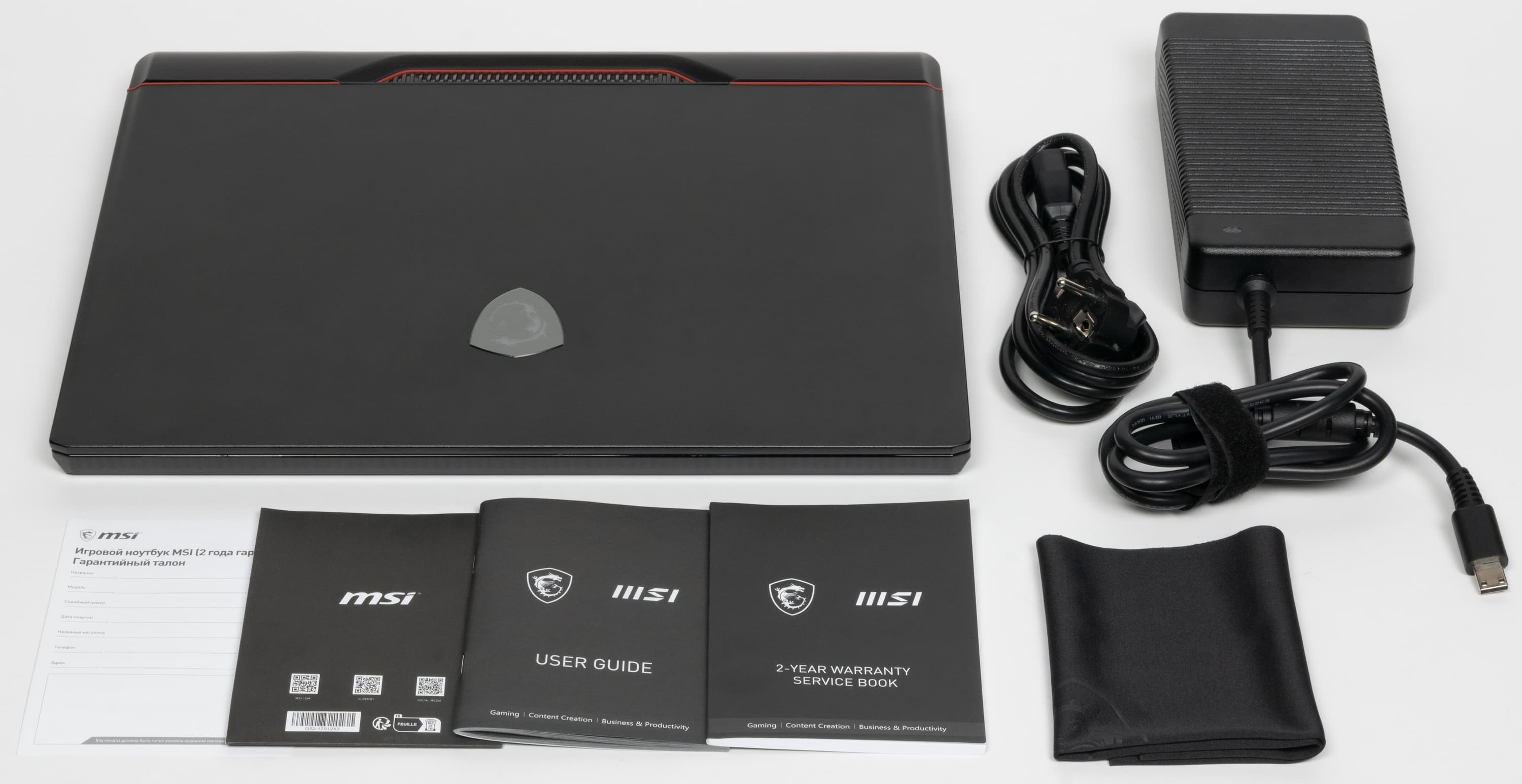 В комплекте, кроме самого ноутбука, имеется блок питания с кабелями (входной съемный, длина 1,7 м; выходной распаян, длина 1,1 м, есть «липучка» для сматывания), набор документации и гарантийный талон.