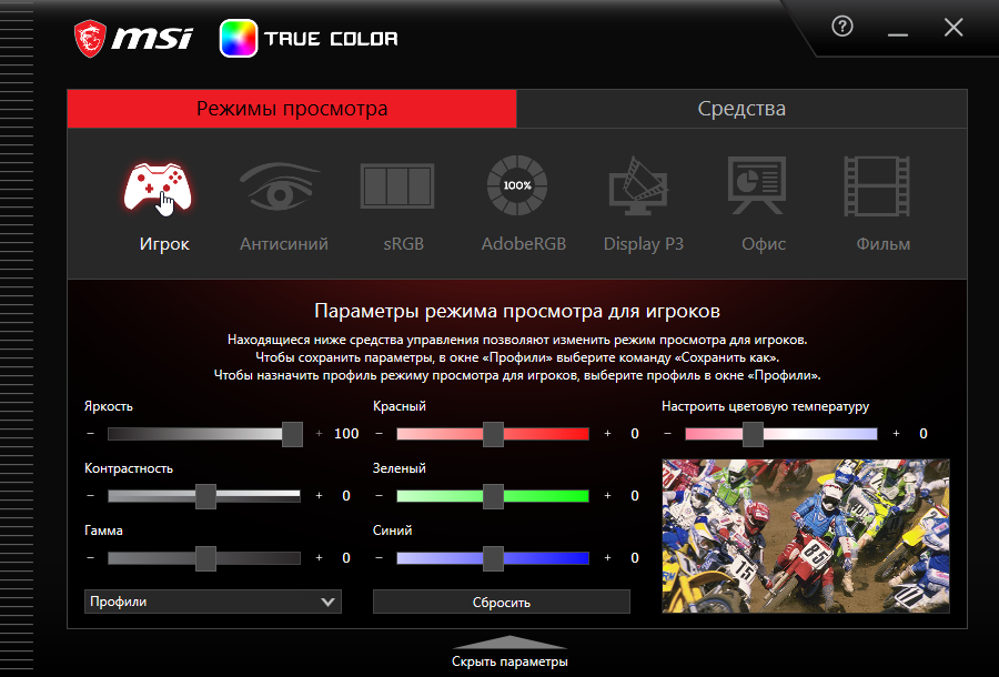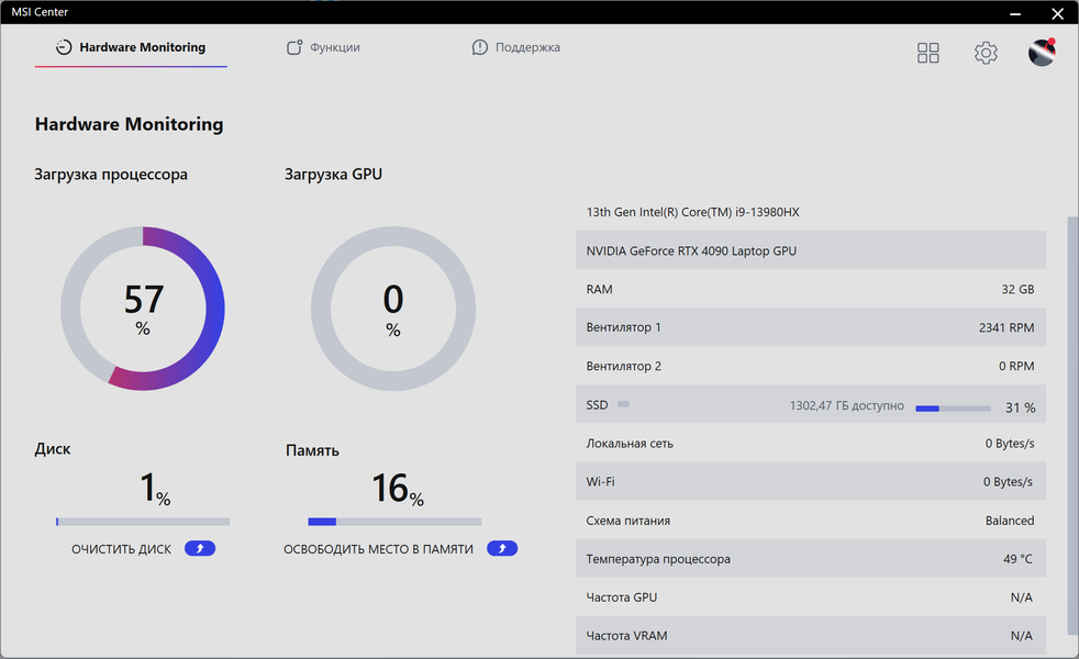 Имеется набор утилит, включая фирменную MSI Center (версия 2.0.26.0), для интерфейса которой можно выбрать и русский язык.