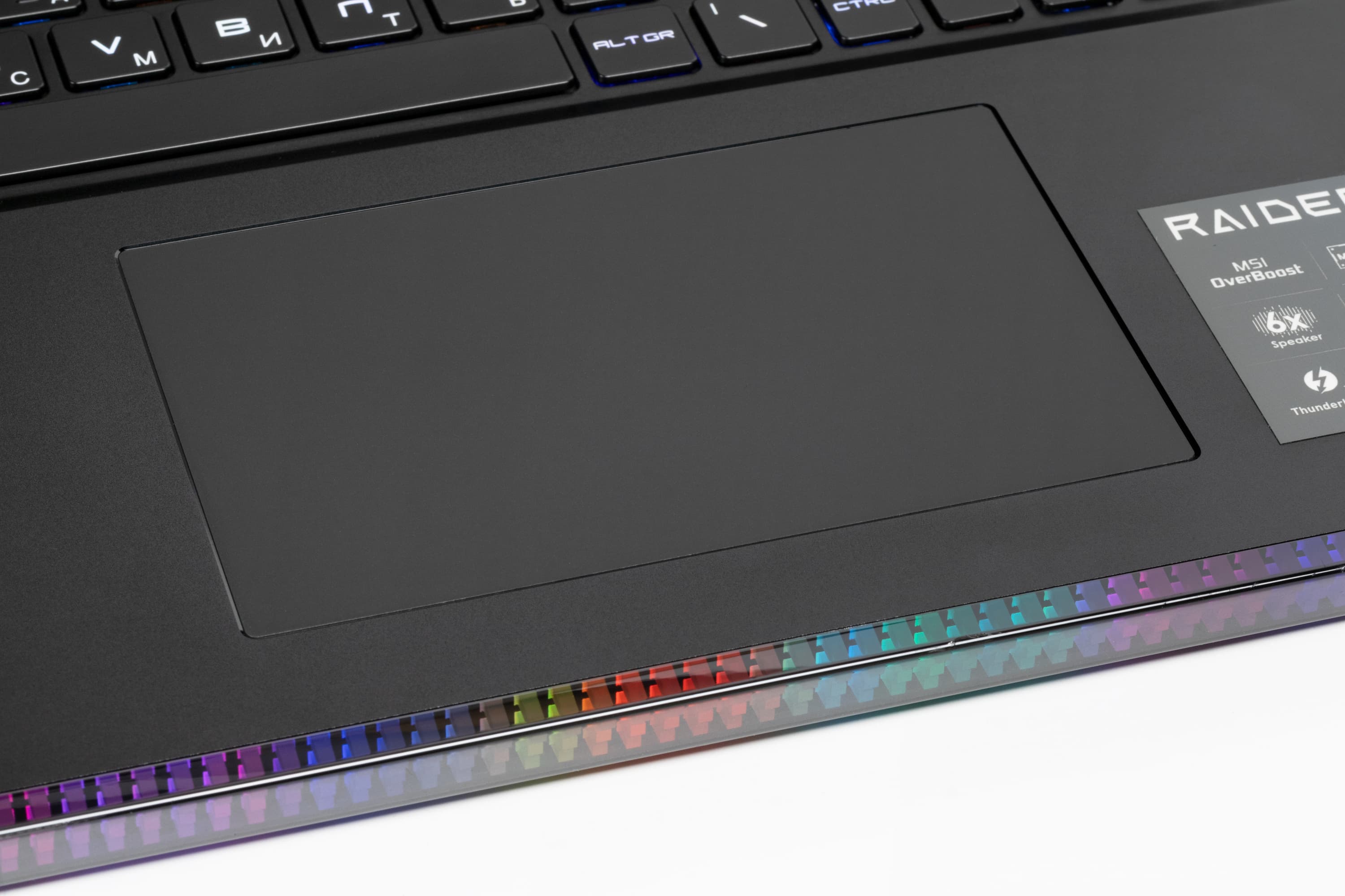 Конфигурация клавиатуры такая же, как и в других современных 17-дюймовых игровых ноутбуках MSI: с нормальными (лишь слегка уменьшенными по размеру) стрелками и цифровым блоком, пусть и трехрядным, с расположением Fn в правой части и выделенными «игровыми» клавишами WASD. RGB-подсветка с эффектами для клавиатуры и внешних декоративных элементов — это на любителя: разного рода световые фокусы нужны далеко не всем, но их при желании можно отключить и оставить для клавиатуры монохромную подсветку.