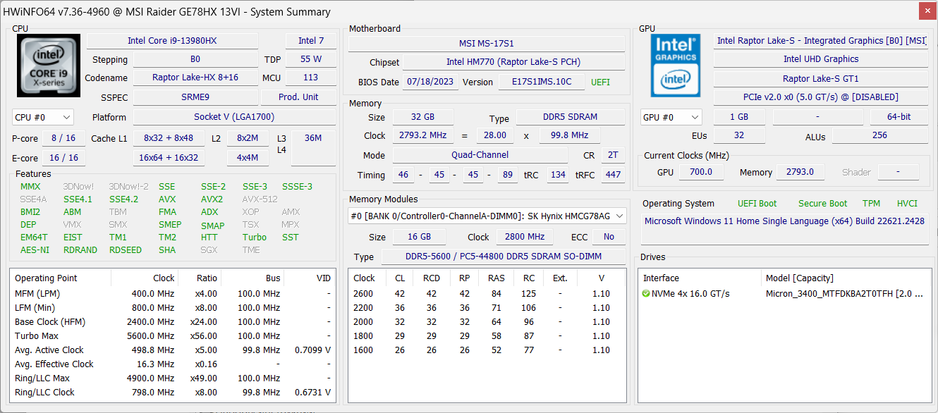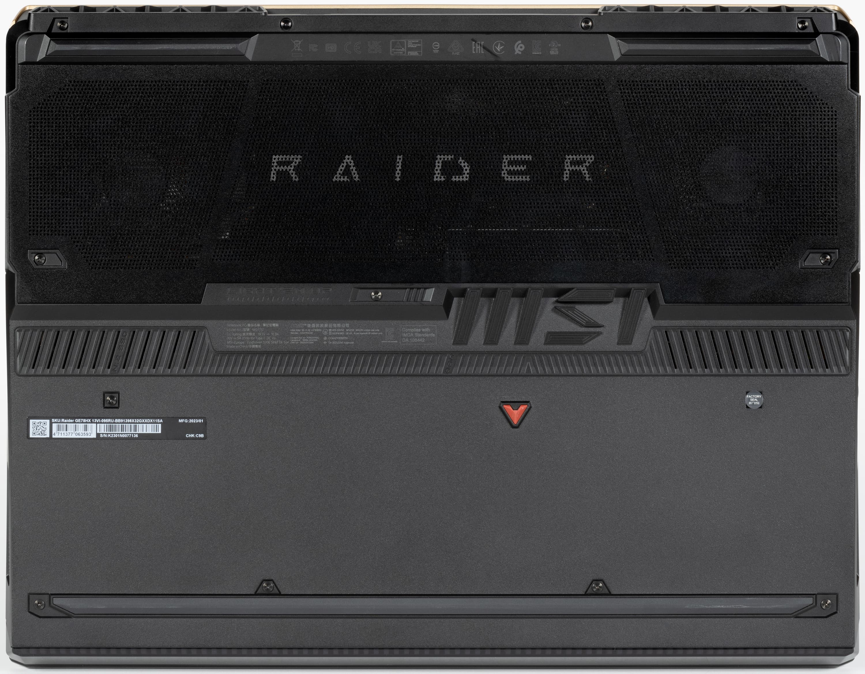 Конкретная модификация определяется буквами и цифрами в конце индекса, нам досталась одна из старших — MSI Raider GE78HX 13VI-095RU (у «совсем старшей» памяти не 32, а 64 гигабайта).