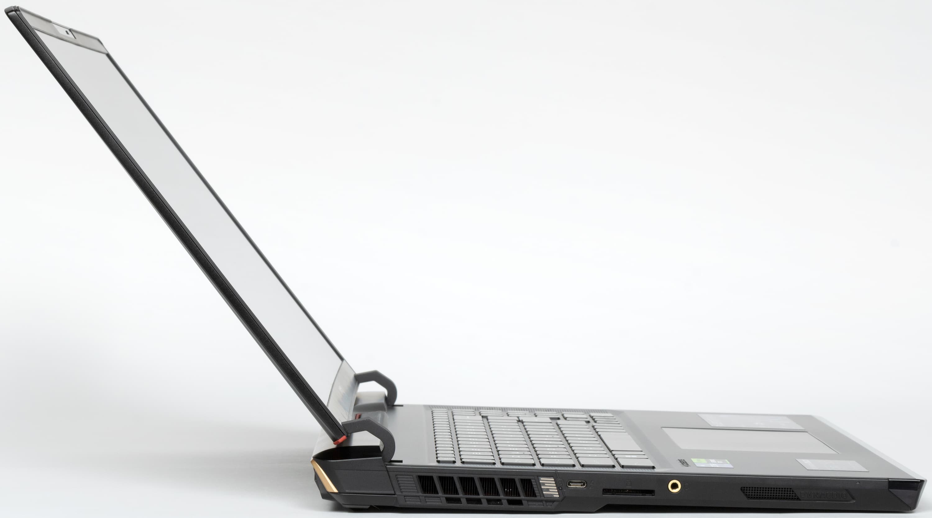 Как и любой игровой ноутбук, тонким аппарат не назовешь. Для толщины заявлено 23 мм, но по нашим замерам в самом толстом месте, ближе к задней кромке, получилось заметно больше — 28,8 мм, а если учитывать резиновую ножку, то и вовсе 32,6 мм. Лишь спереди (не у самого края, а возле передней ножки) толщина составляет те самые 23 мм.