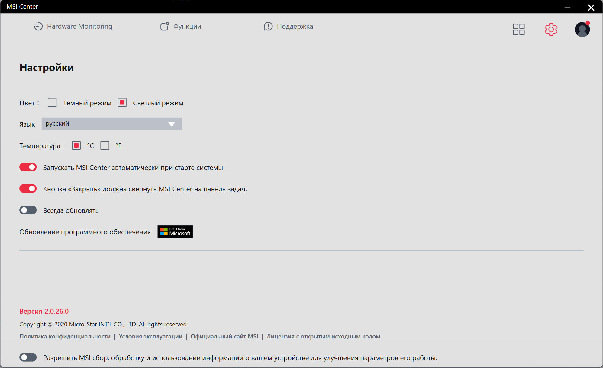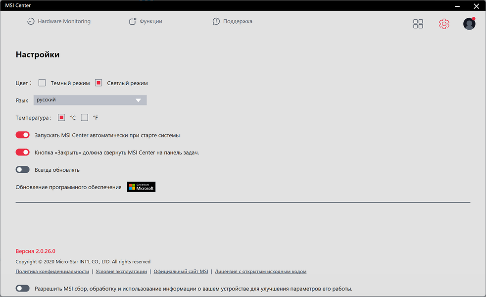 Клик по шестеренке в правом верхнем углу окна переводит в общие настройки утилиты. Помимо смены языка, можно выбрать темную или светлую цветовую схему, отключить запуск MSI Center при старте системы, управлять обновлениями утилиты и сбором информации об устройстве.