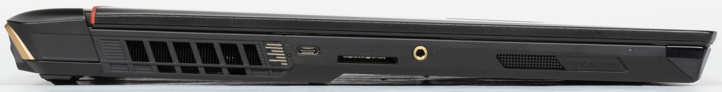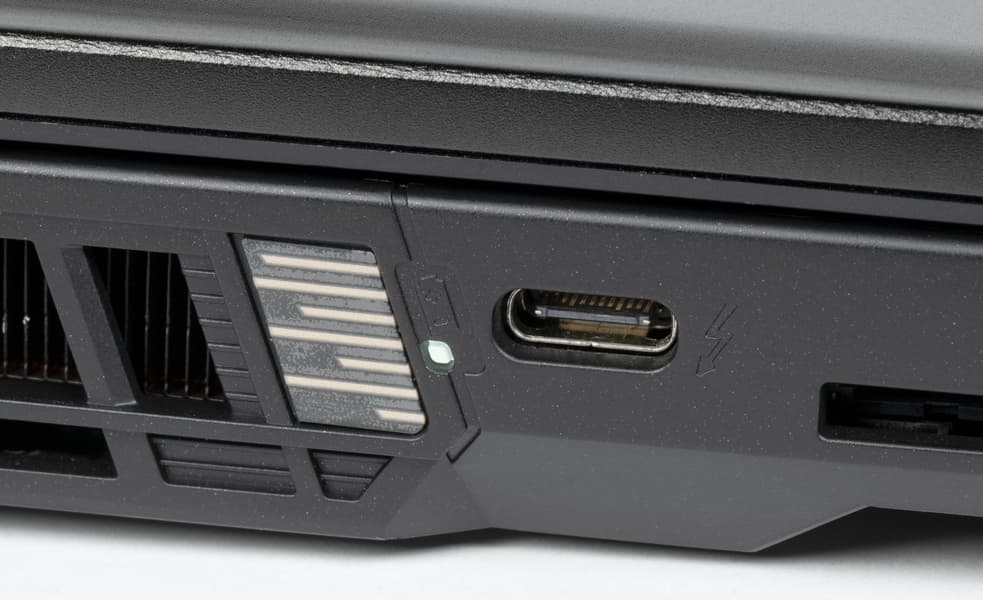На левом боку ноутбука расположены порт Thunderbolt 4 (Type-C), прорезь картовода SD и комбинированный миниджек для аудиогарнитуры. Имеется и крошечный индикатор, который светится желтым при низком остатке энергии в батарее, белым в процессе зарядки (гаснет при полном заряде) и мигает, если батарея неисправна; при нормальном расположении оператора этот индикатор не виден, приходится заглядывать сбоку.
