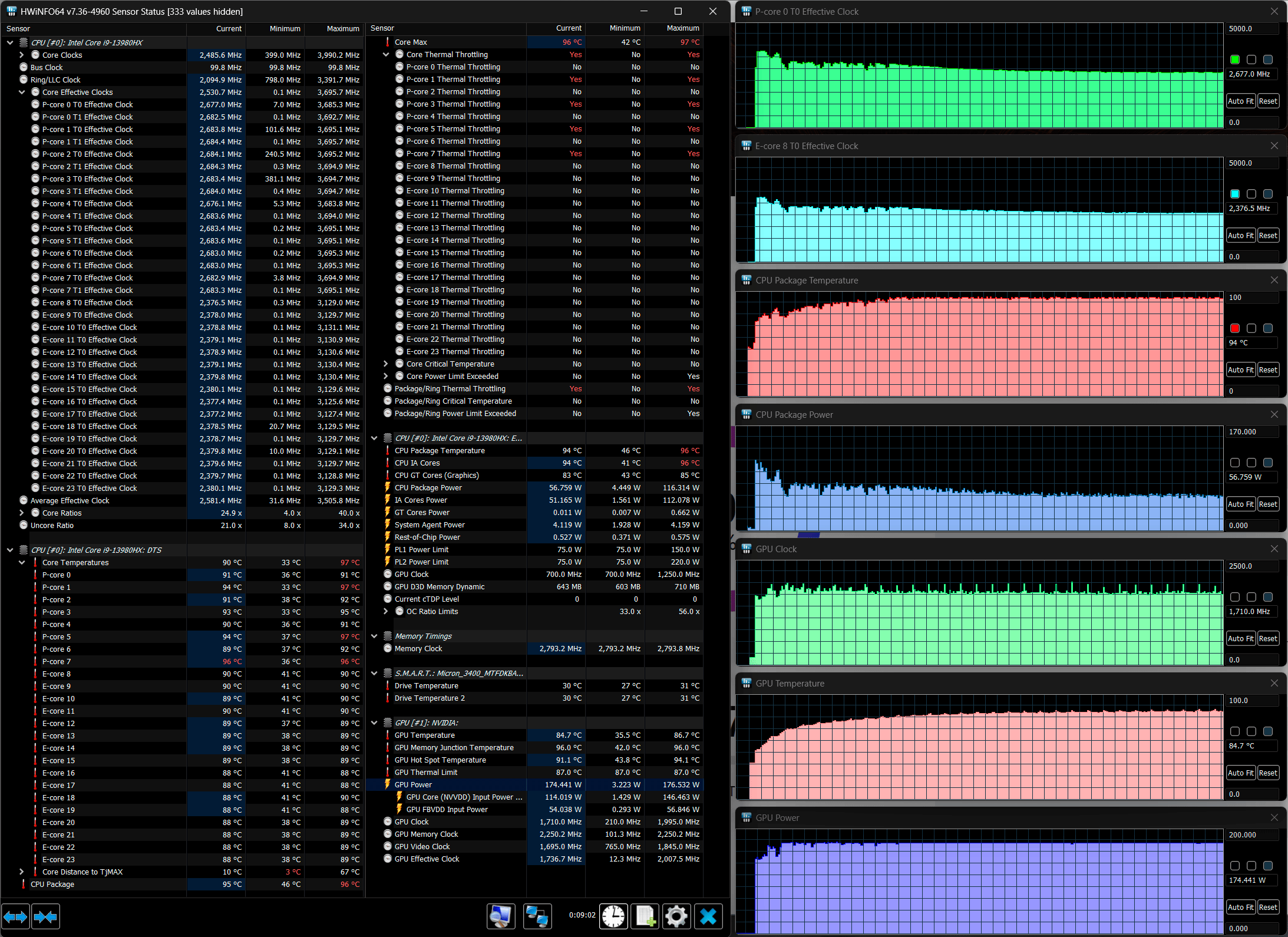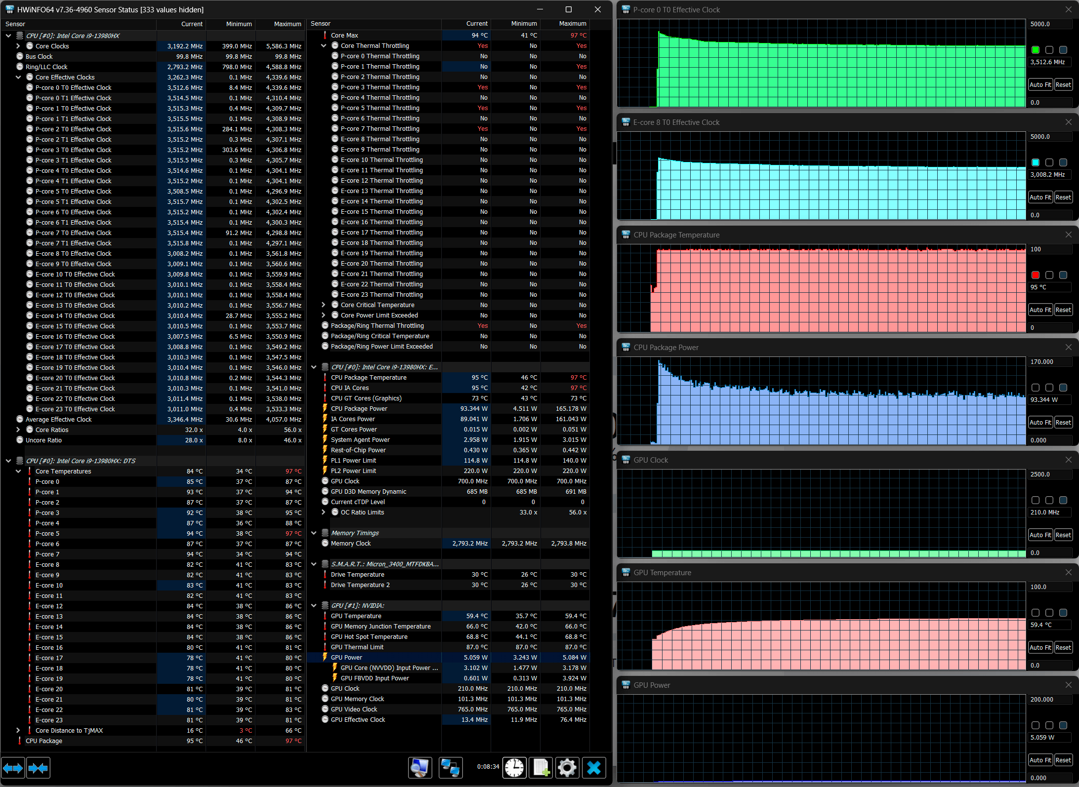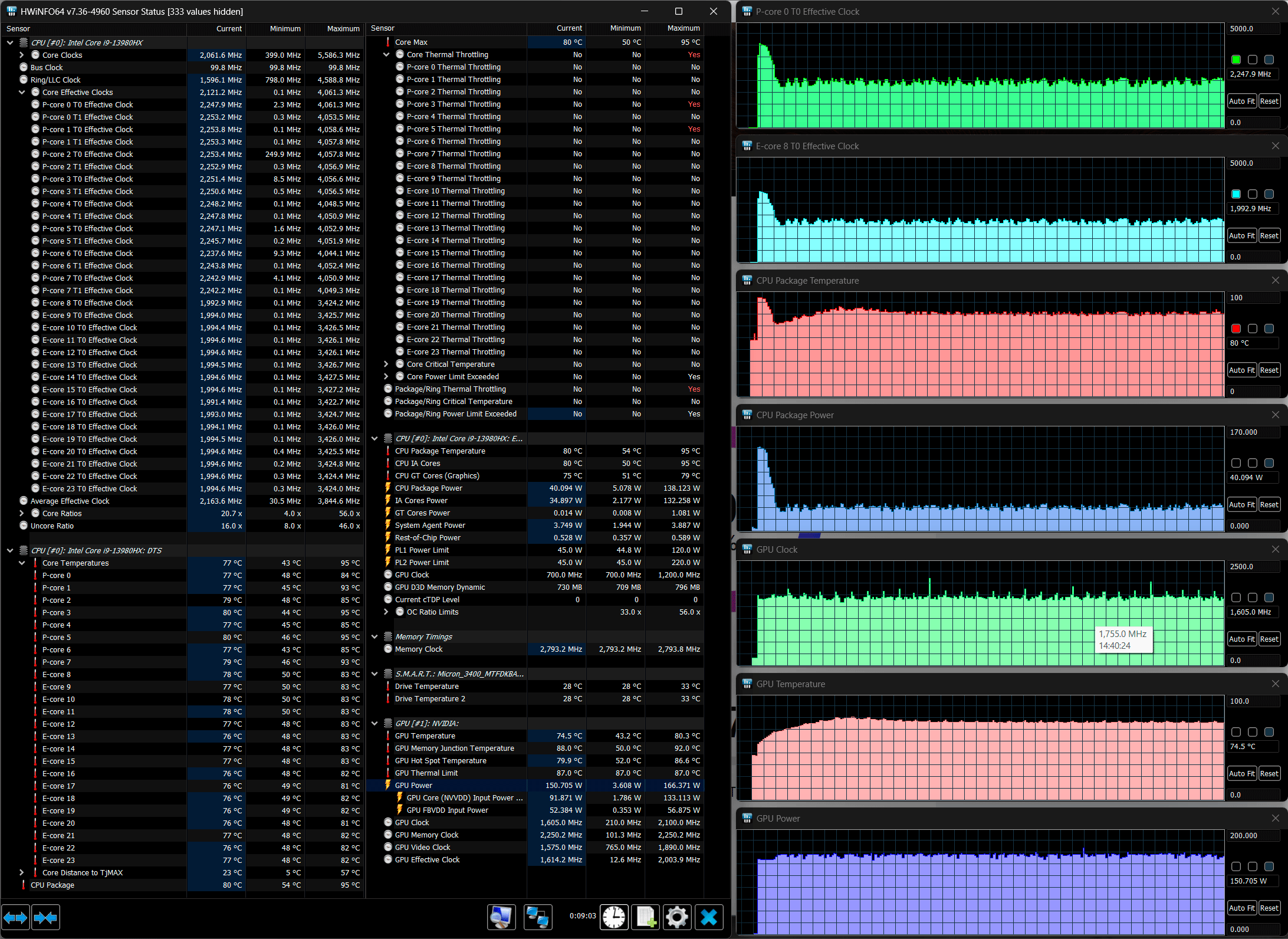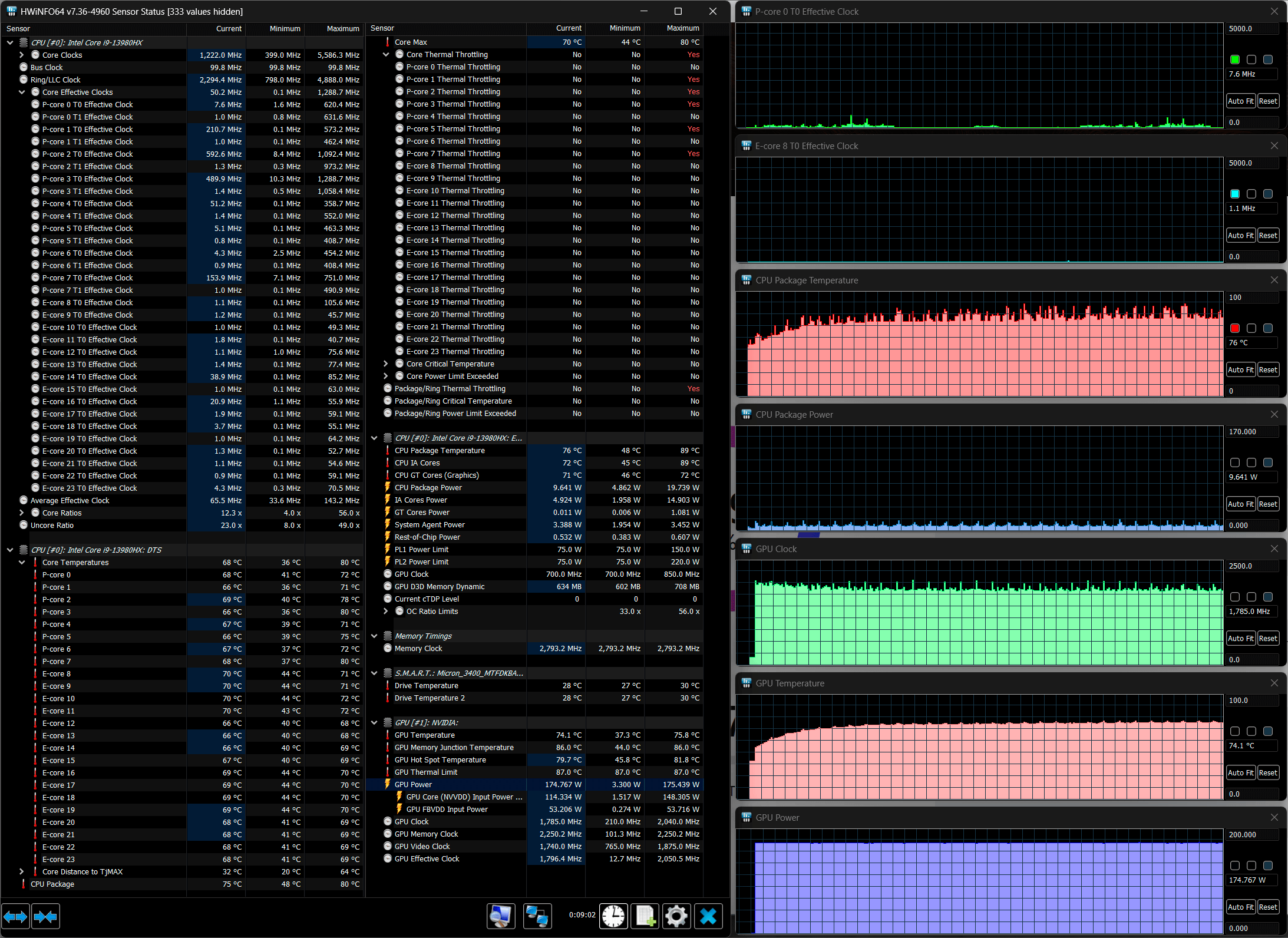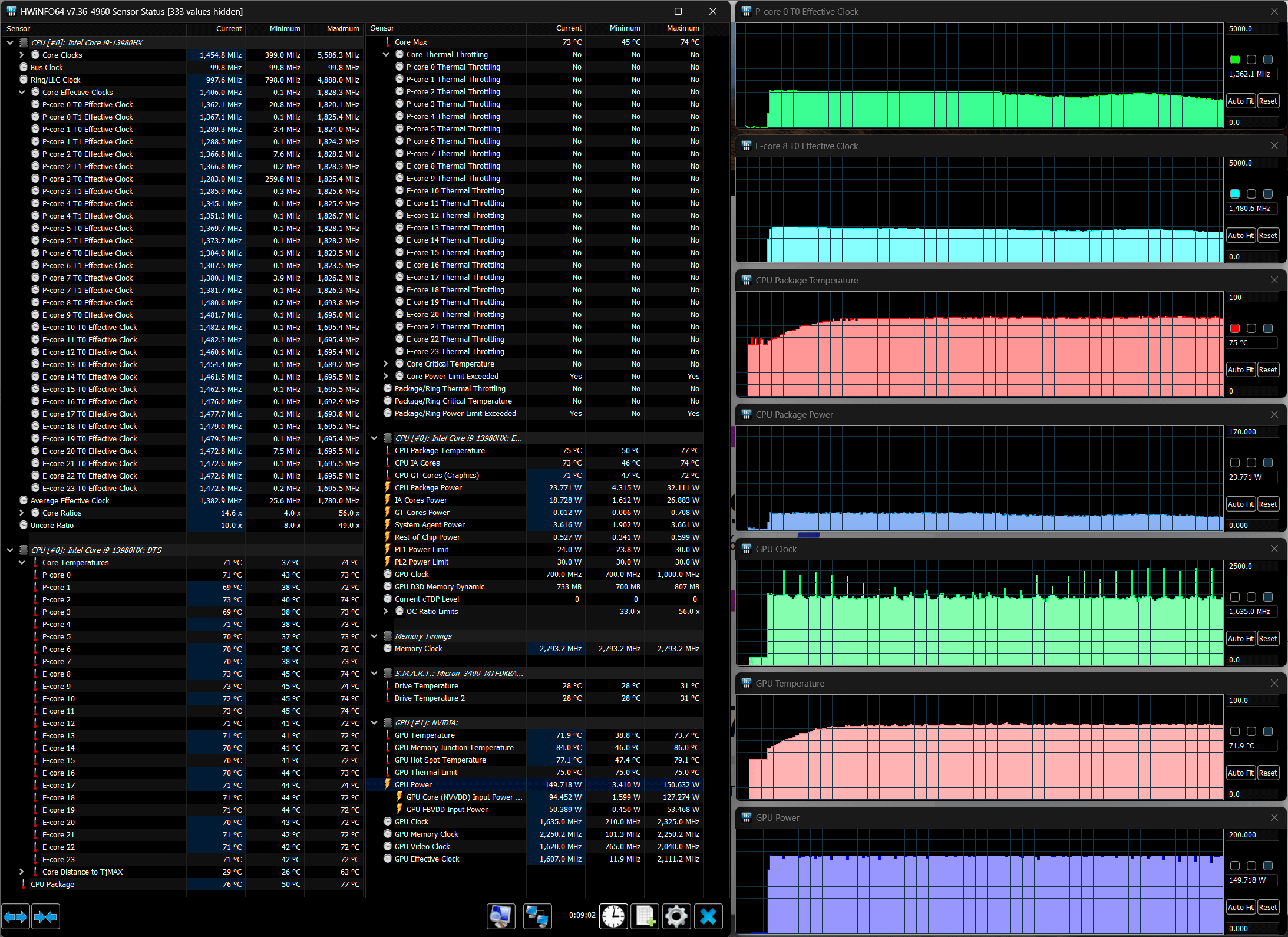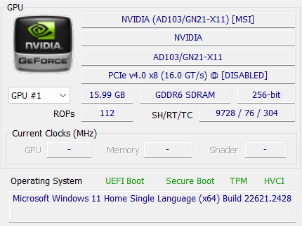 В играх по понятным причинам используется дискретный видеоадаптер. Для рабочих характеристик видеокарт GeForce RTX 40 их производитель Nvidia заявляет возможные диапазоны: для GeForce RTX 4090 Laptop заявлены частоты от 1455 до 2040 МГц и потребление от 80 до 150 Вт, разработчики ноутбуков могут выбирать режимы в этих пределах. Так, для MSI Raider GE78HX 13VI-095RU заявлена частота до 2040 МГц и потребление до 175 Вт (при динамическом ускорении); как показано выше, видеокарта действительно может работать с такими показателями.