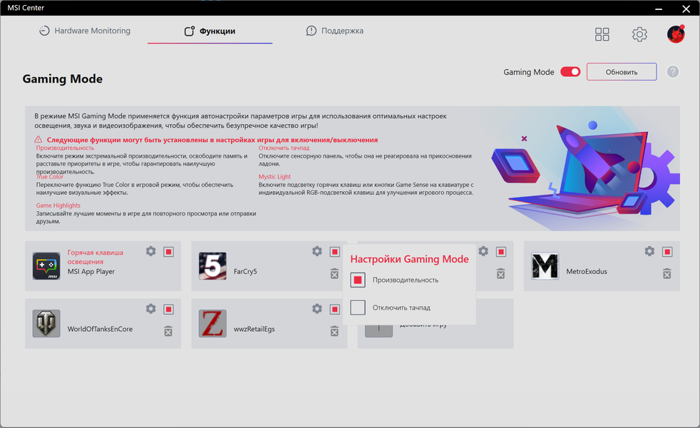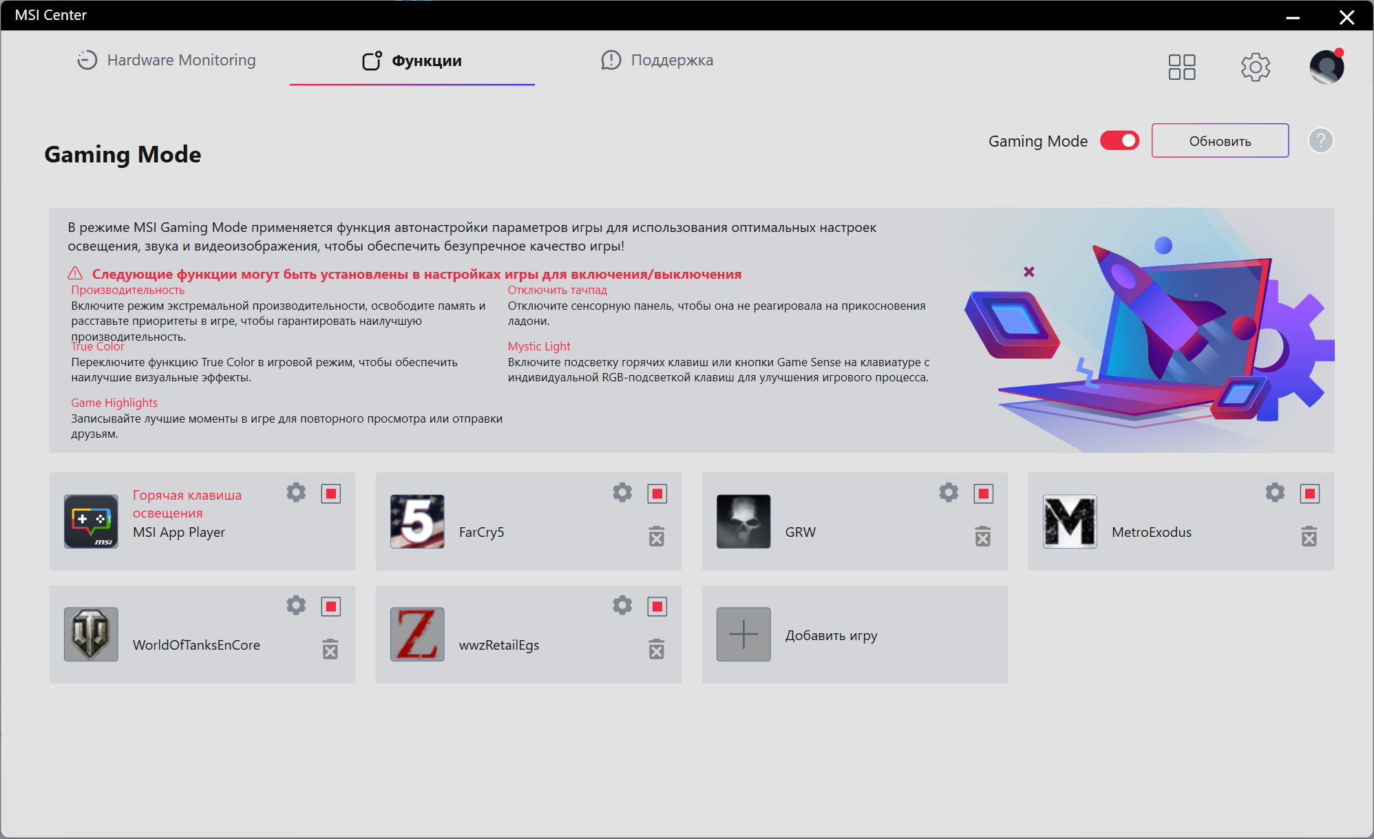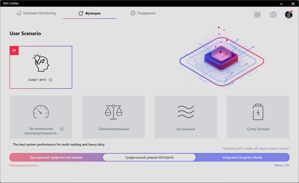 Чтобы исключить влияние сценариев в MSI Center, автозагрузку этой утилиты в исследуемом ноутбуке выключаем. Выбор видеокарты — автоматический MSHybrid.