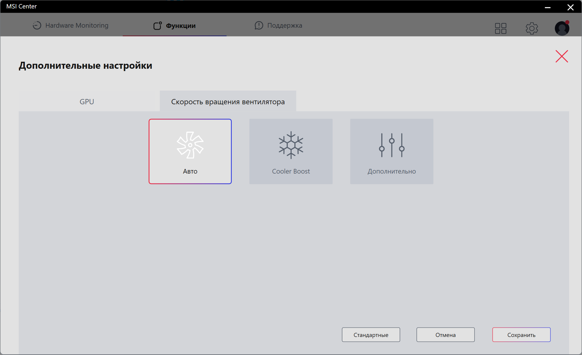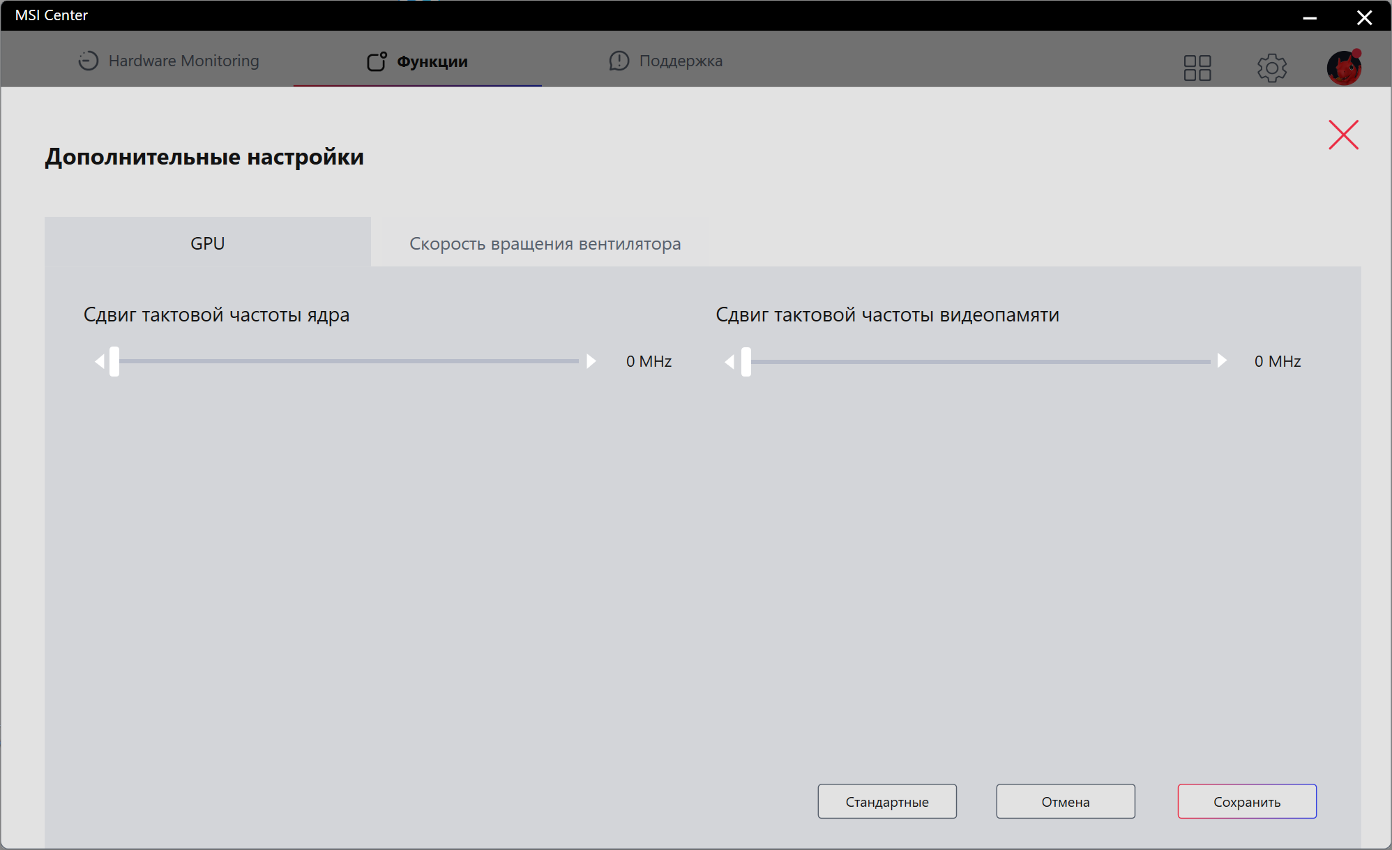 | Номинальные частоты GPU и памяти (без MSI Center) | Частоты GPU и памяти увеличены на 200 МГц (MSI Center, профиль «Экстремальная производительность») | |