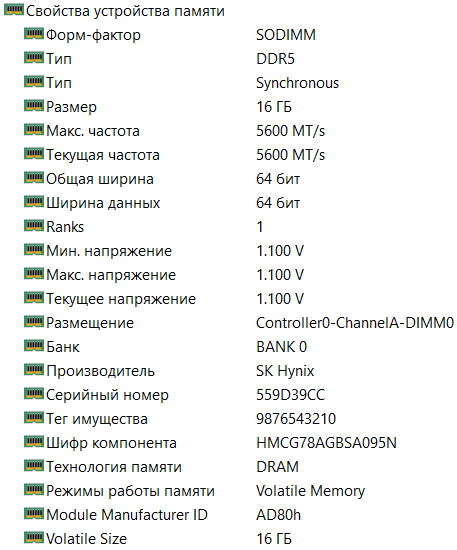 | Оперативная память | 32 ГБ DDR5-5600 (2 × SO-DIMM Hynix HMCG78AGBSA095N) оба слота заняты | |