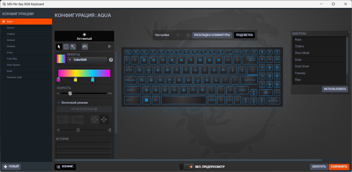 Начнем с клавиатуры, для нее вызывается отдельное окно MSI Per Key RGB Keyboard. Используя готовые конфигурации и выбирая для них эффекты и параметры, можно задавать различные варианты цветовых переливов, в том числе и постоянную подсветку выбранным цветом.