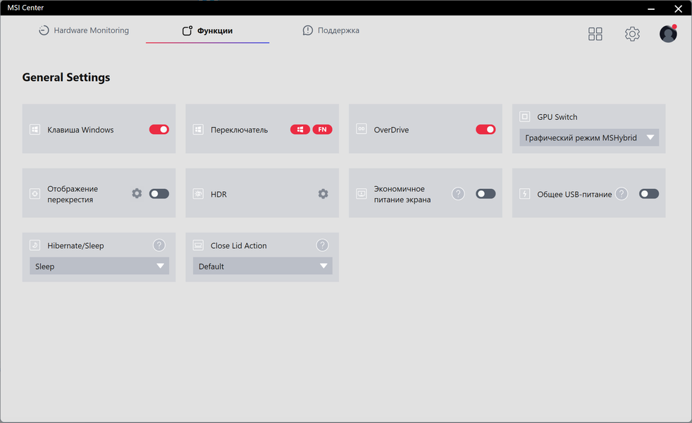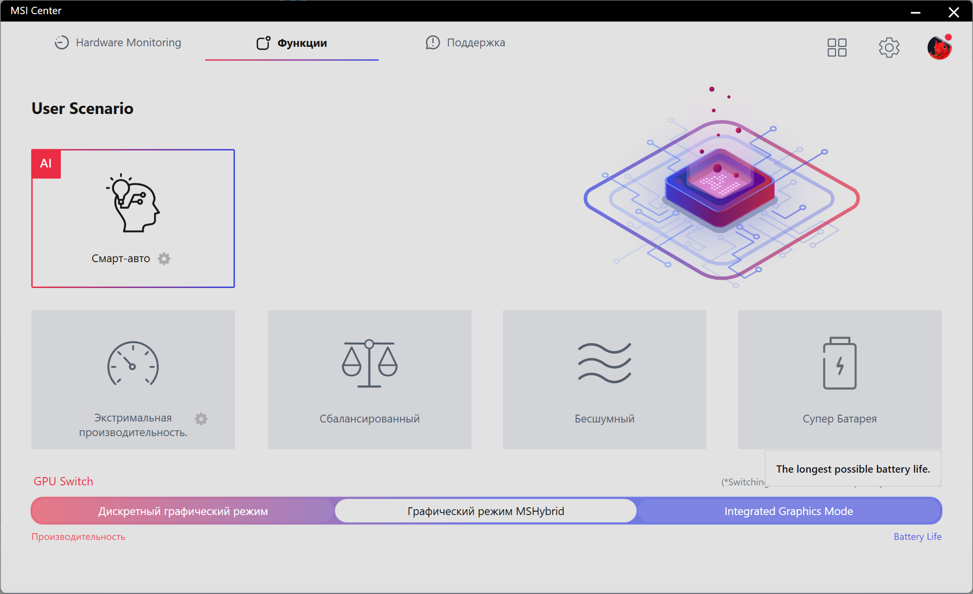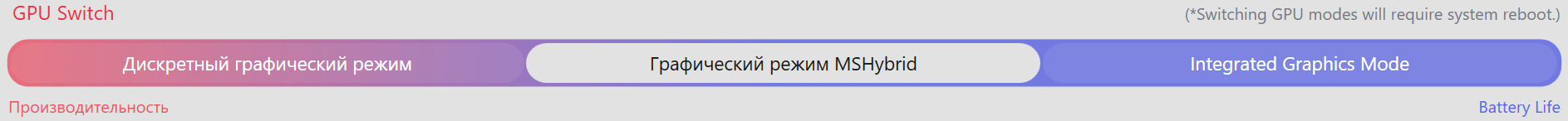 Здесь же производится переключение между интегрированной и дискретной графикой с помощью функции GPU Switch (в нижней части окна), которая позволяет задать порядок использования интегрированной и дискретной видеокарт: только ту или только другую, а также режим MSHybrid для автоматического выбора одной из двух в соответствии с потребностями конкретного приложения.