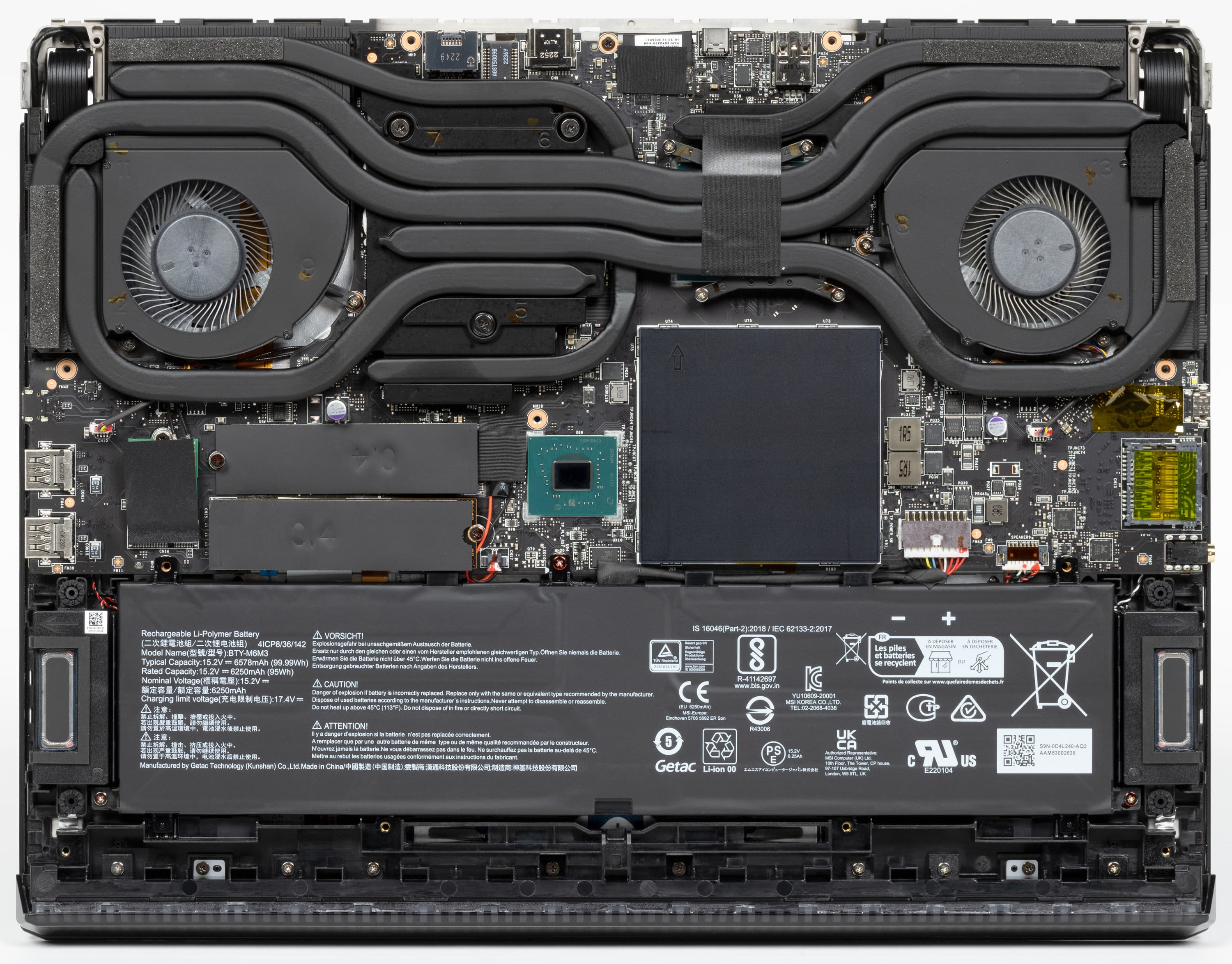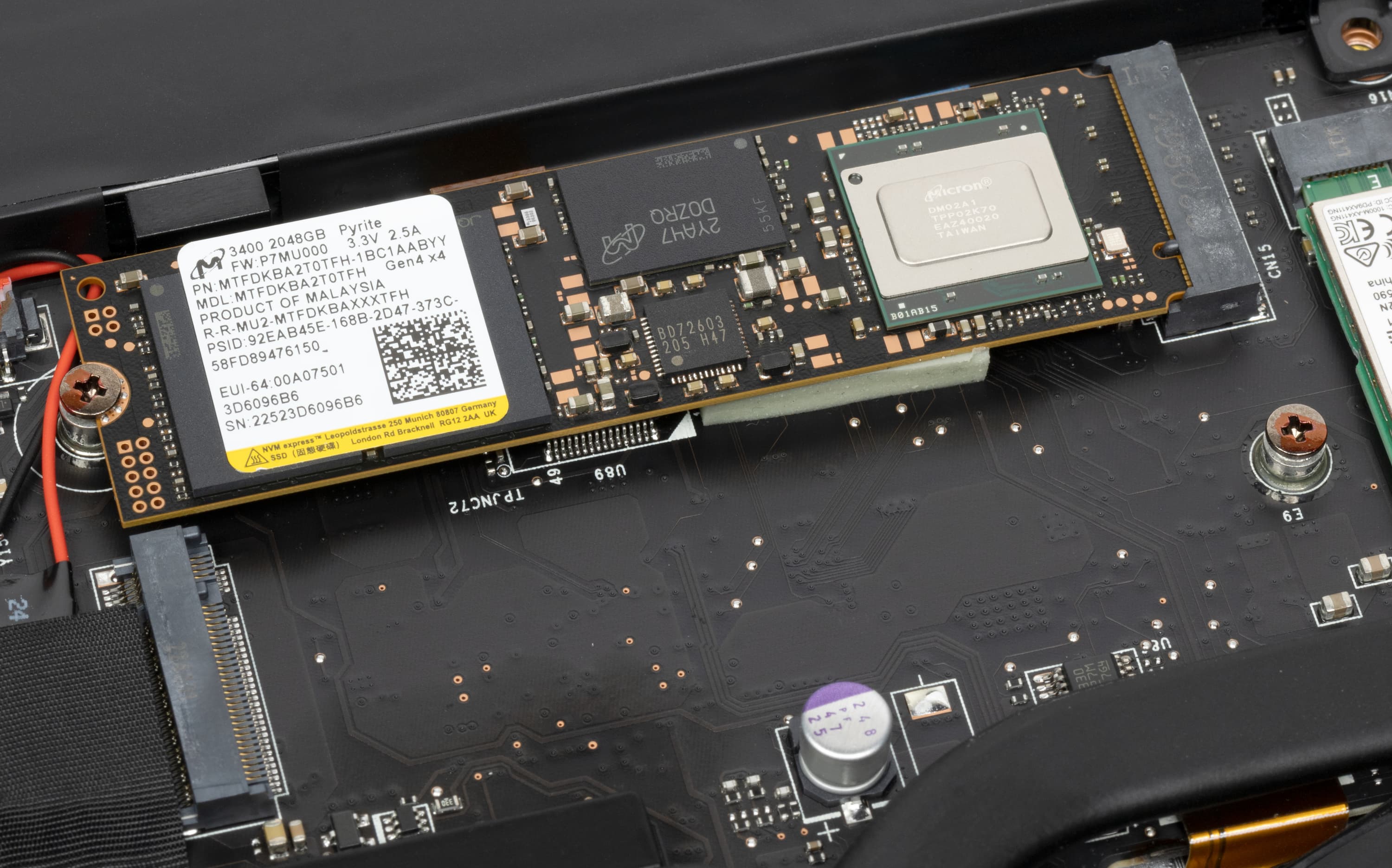 Такие показатели достигнуты использованием топовых на сегодняшний день процессора Intel Core i9-13980HX и видеокарты Nvidia GeForce RTX 4090 Laptop. Немного подводит разве что использованный накопитель SSD PCIe — он хорош, но до лучших образцов всё же не дотягивает, однако при необходимости можно поставить более производительный в свободный слот М.2 и перенести на него ОС, а имеющийся оставить для хранения данных.