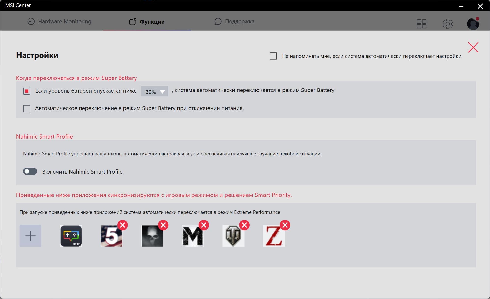 Какие-либо настройки есть лишь в сценариях «Смарт-авто» и с экстремальной производительностью. В первом случае они касаются автоматического переключения в режим «Супер Батарея» в определенных условиях питания или на экстремальную производительность при запуске выбранных приложений, а также включения профиля Smart утилиты Nahimic (о ней ниже).
