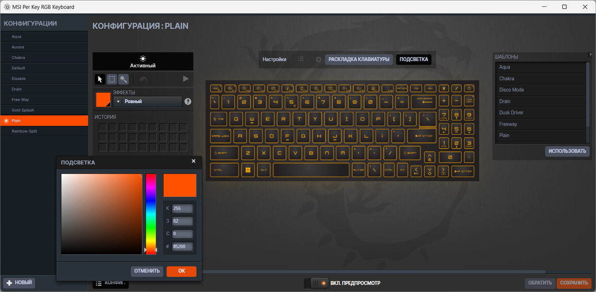 Есть возможность предпросмотра — заданное будет сразу воспроизводиться органами подсветки клавиатуры.